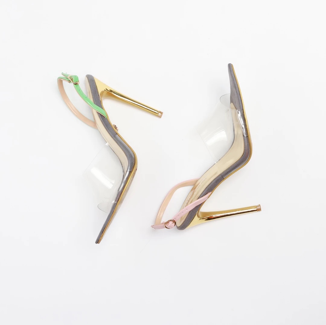 The latest $135 SybG Perfect Match PVC Sandals arrives in a new multicolor combination which includes the colors pink, gray, and green. Aside from the newest colors, it stays true to the sandals perfectly imperfect nature as it comes mismatched with PVC straps, 4.5 inch gold heels, and single back straps.
