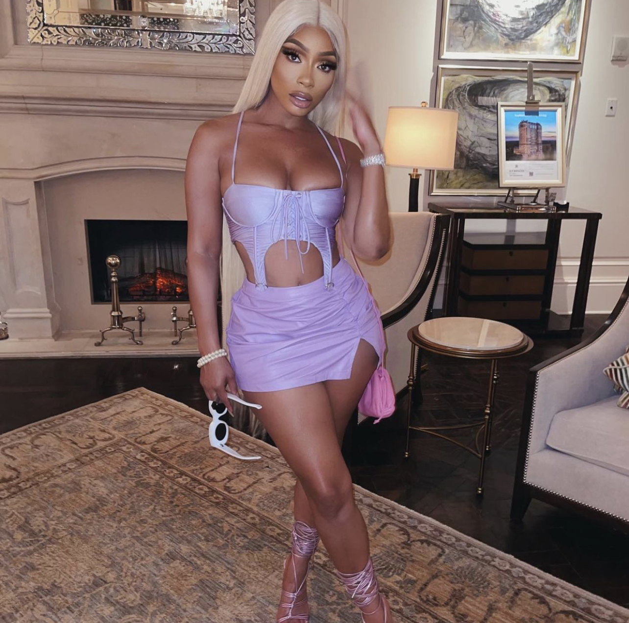 Tommie Lee wore Fashion Nova’s $37.99 Love Fool PU Leather Skort in lavender. The high-waist PU leather skort offers mini skirt feels in the front with the impression of a shorts in the back. The front mini skirt part features a ruched detail along with a slight slit. She rocked the skort with a purple cutout bustier top, metallic strappy heeled sandals, white Loewe sunglasses, and what appears to be a mini Bottega Veneta pink pouch bag.