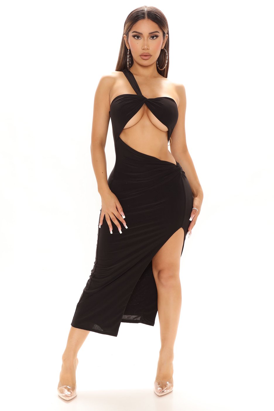 Draya Michele wore Fashion Nova’s $39.99 Very Special Double Lined Midi Dress in black. Presenting itself in fuchsia as well, the dress has a one-shoulder detail which finds itself connected to the dress’s top by a knot. It also comprises of a cutout detail, revealing much of the wearer’s abdomen. For a sexy finish, the dress has a head-turning thigh slit. Draya allowed the dress to steal the spotlight, opting for minimal jewelry. She completed her look with a sleek short bob cut.