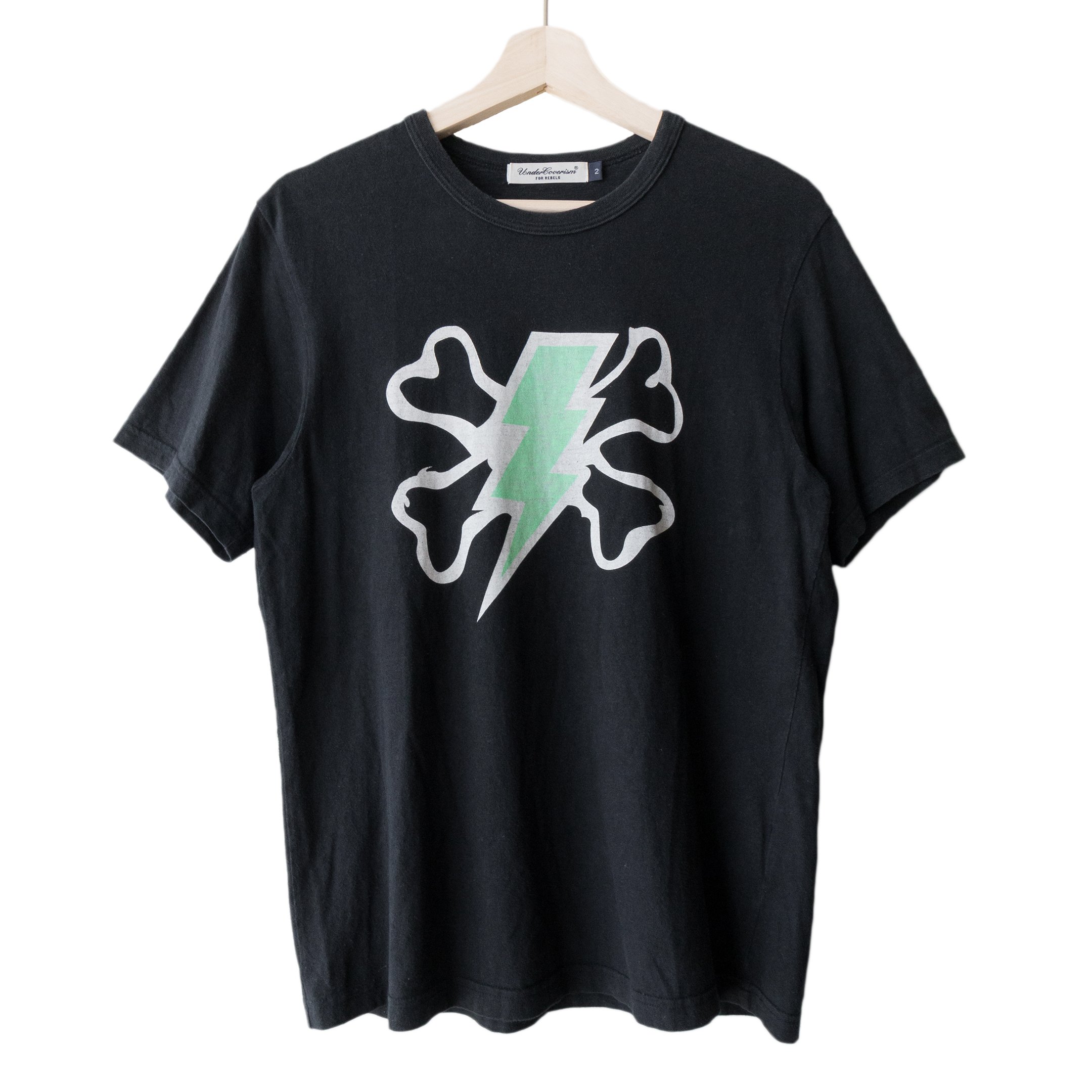 A$AP Rocky wore a $90 UNDERCOVER “Chaotic Discord” lightning bolt t-shirt and zip-up hoodie from the brand’s Spring/Summer 2001 collection. He paired the UNDERCOVER pieces with Needles x AWGE side-striped pants and Vans sneakers. He also opted for a hat with a green undervisor and a stack of silver necklaces.