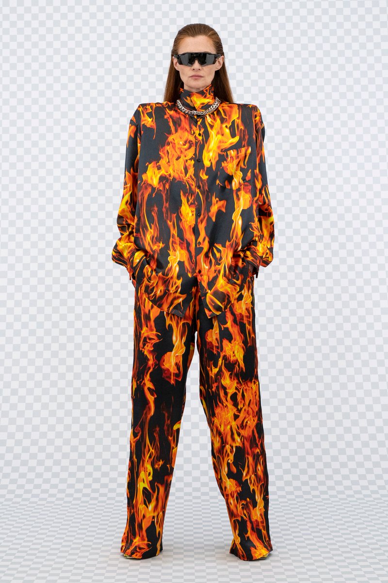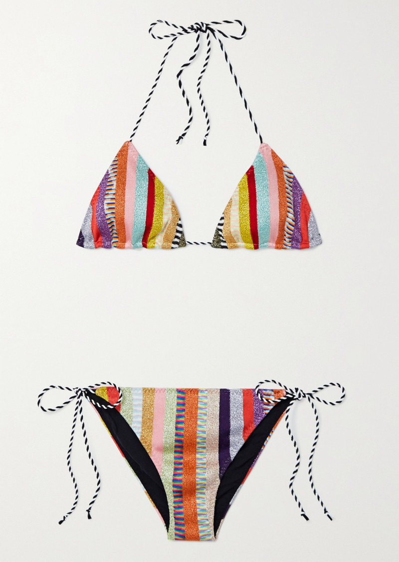 Rihanna wore a Vetements Spring/Summer 2022 silk flame print shirt (not yet available) paired with $230 Fenty Super Mini Denim Shorts (oh, how we miss Fenty). Underneath the Vetements flame print shirt, she wore the Missoni Mare Riga Striped Bikini Top (sold out). She accessorized the look with $650 Givenchy Two Toe Leather Sandals, vintage Fendi Beaded Lizard Baguette Bag (unavailable), and $250 Linda Farrow x The Attico “Marfa” sunglasses. She also rocked the Briony Raymond $14,800 Jumbo Zodiac Pisces Medallion again as well, which is slowly becoming the music artist’s new go-to necklace.
