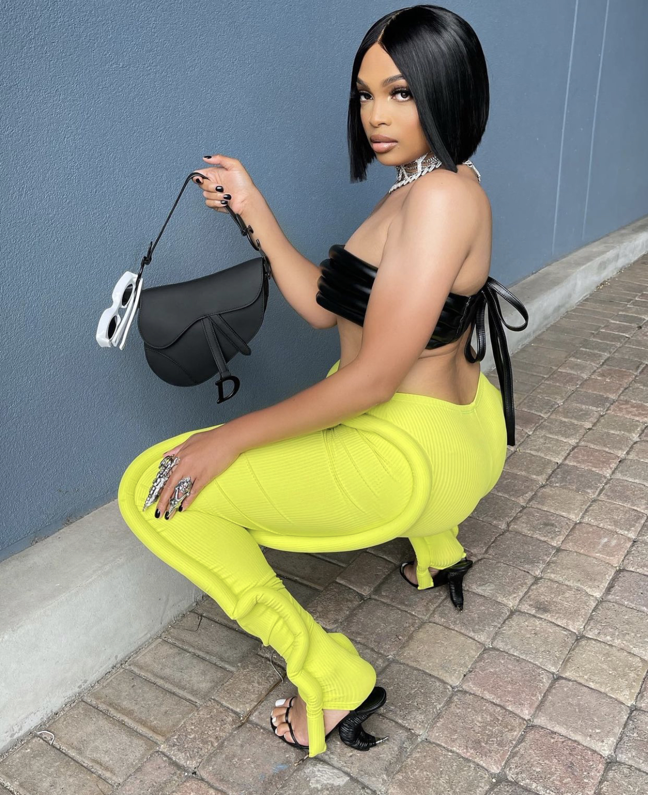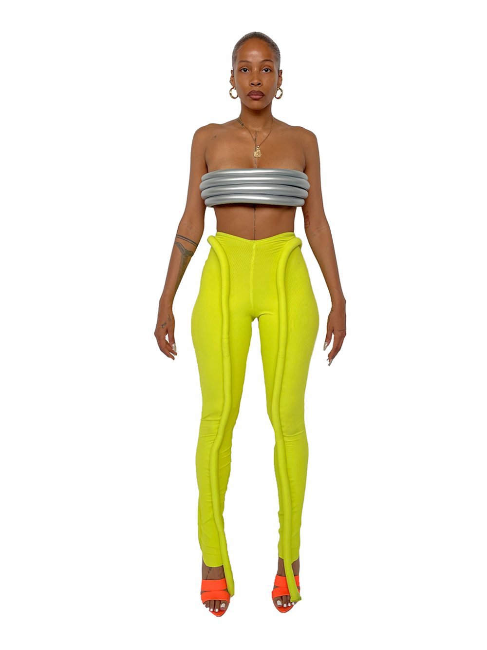 Alonzo Arnold stepped out in a head-turning look by TLZ L’Femme including the brand’s $178 Tube Bandeau Top (unavailable in black) and $238 Tube Citron Leggings. While designer Aazhia Rhy has always been seen as a forward thinker in the fashion game, she decided to take her Juice ’21 collection out of this world with its futuristic silhouettes and design elements. The Tube Cutron Leggings appear in a popping citrus green colorway complete with an eye-catching tube detail that runs from the front of the garment down to the back.