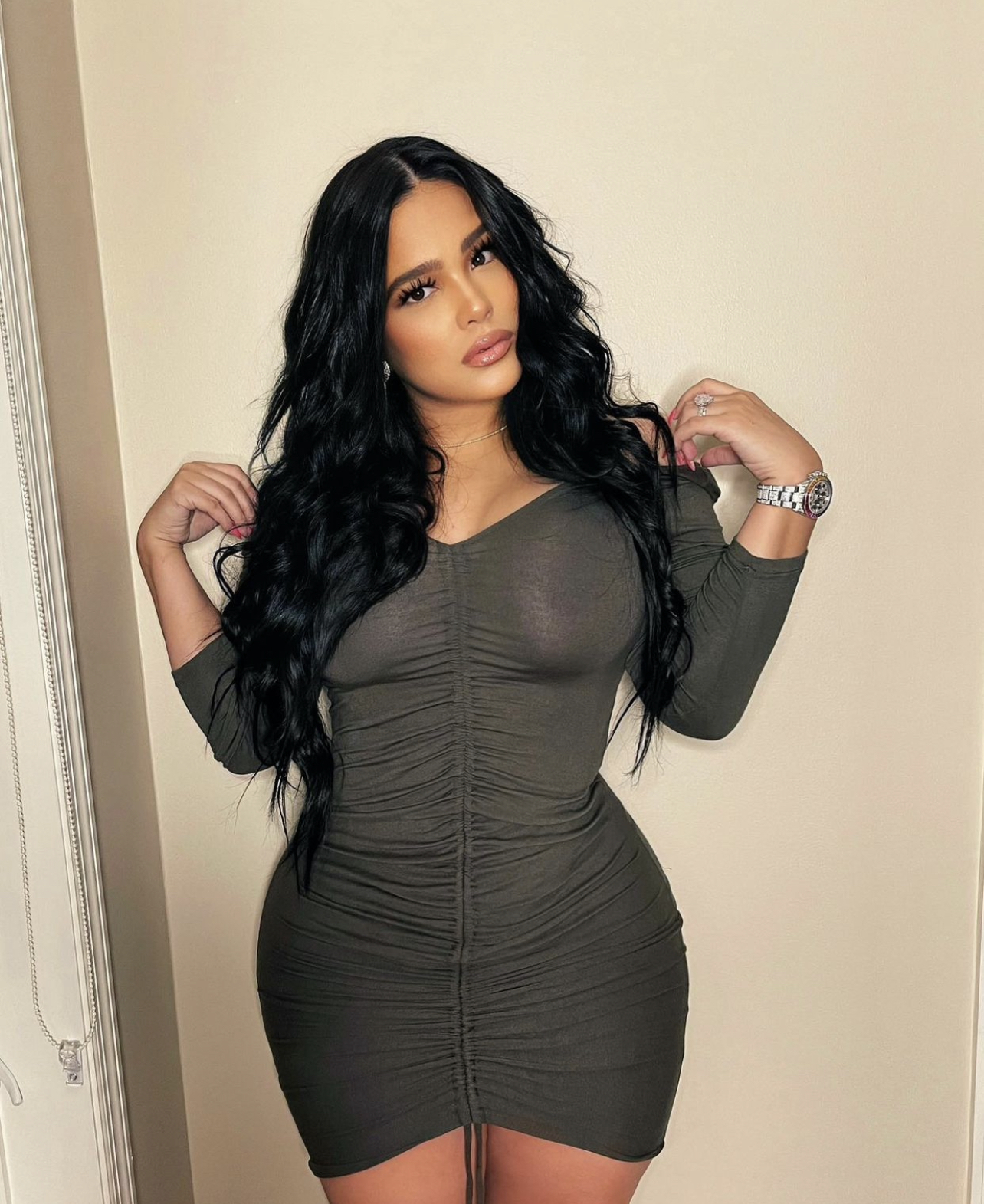 Emily B struck a pose in Fashion Nova’s $22.99 Guangzhou Ruched Dress in black. Perfect for the approaching Fall season, the dress features long sleeves long and a ruched design with adjustable drawstrings trailing down the front of the garment. Additionally, the Guangzhou Ruched Dress also comes in navy and pink. Emily B styled the dress with a subtle choker necklace, watch, and ring along with long beach wavy hair.