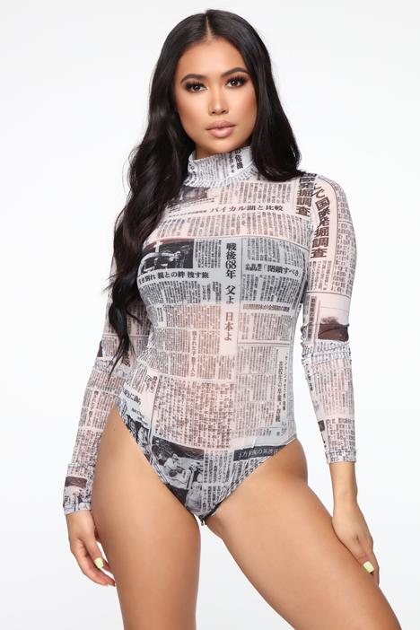 Blac Chyna wore Fashion Nova’s $34.99 Read Me Mesh Bodysuit. The long sleeve bodysuit appears in an allover newspaper print with a mock neck detail. Since the top is mesh, it is slightly see-through as evident on Blac Chyna. For accessories, she paired the look with a distressed jeans, a Chanel bag, and platform sneakers.