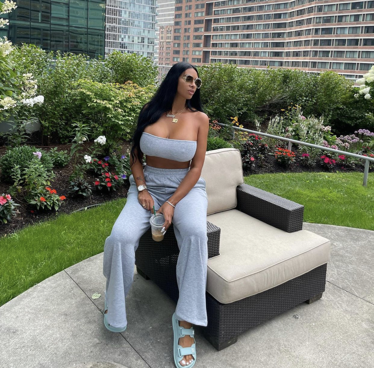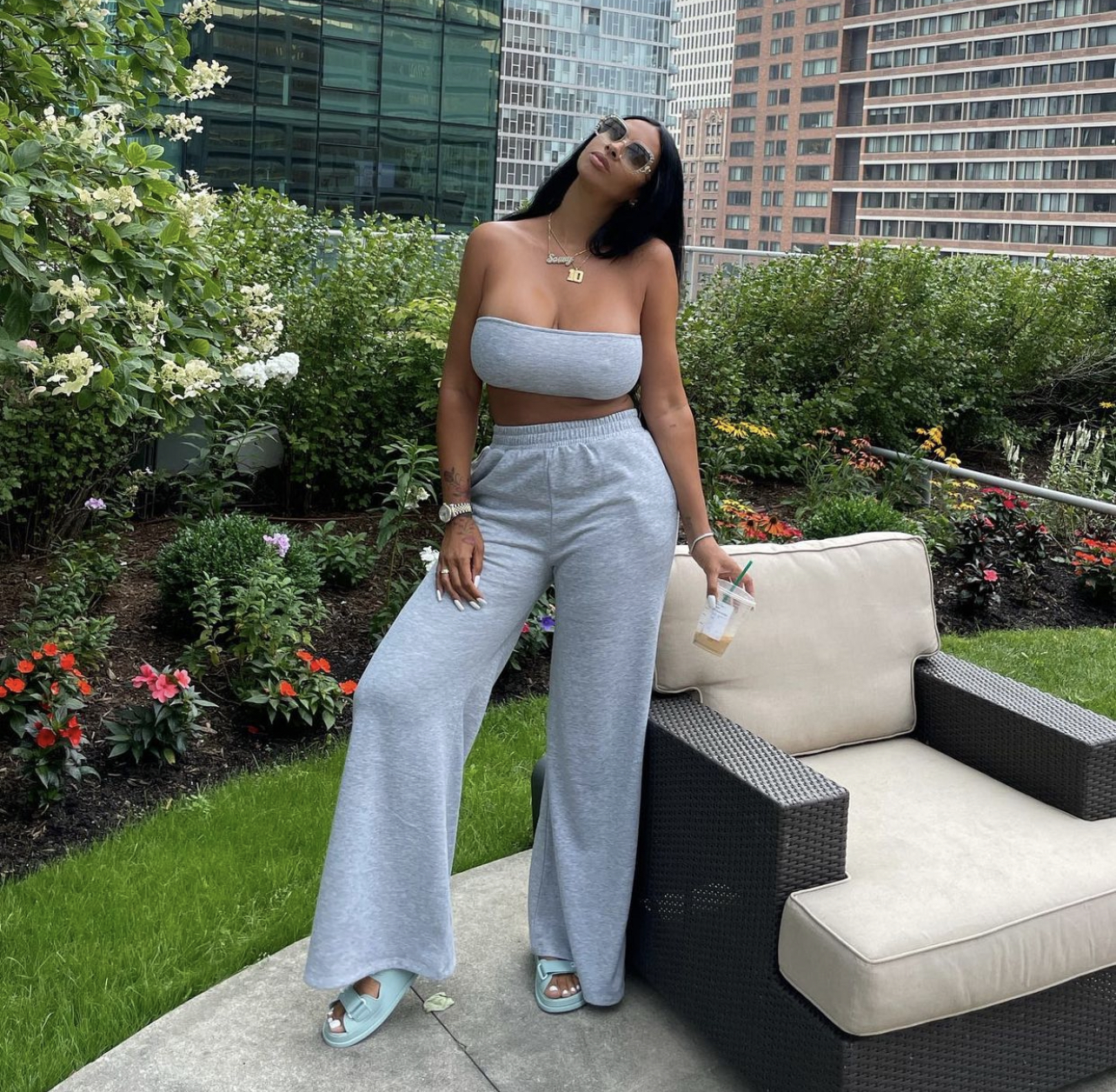 Johanna Leia was spotted enjoying a day in the city and keeping it chill in a grey lounge set. The mom-preneur was outfitted in a grey bandeau top and sweatpants from Fashion Nova, giving us a chic yet relaxed style moment.
