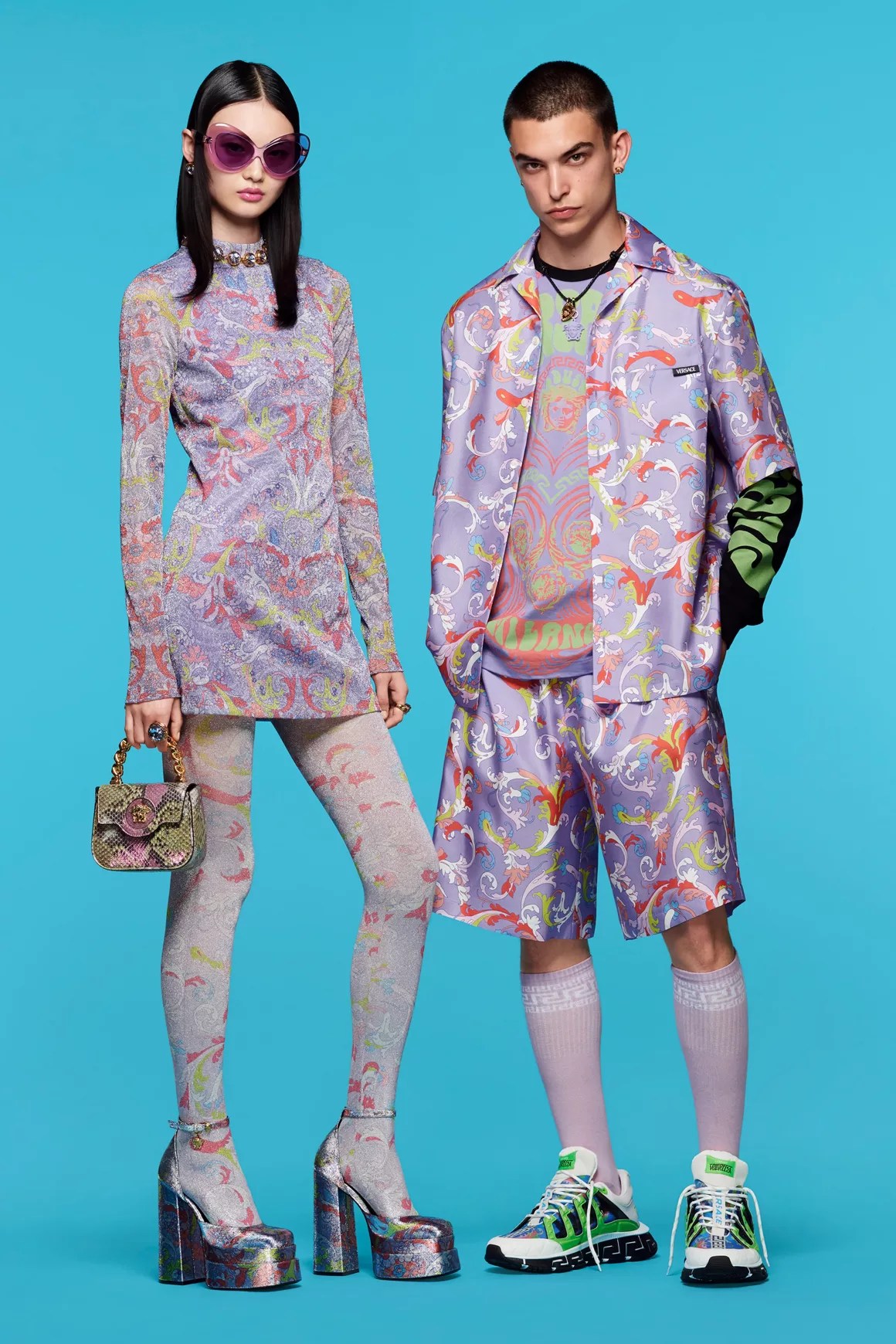 Newton’s daughter Nico Parker wore a custom Versace Resort 2022 look, styled by Jason Bolden. Her look included a sleeveless mini dress and matching footed tights in a colorful jacquard print design. She paired the look with a pair of silver platform heels.