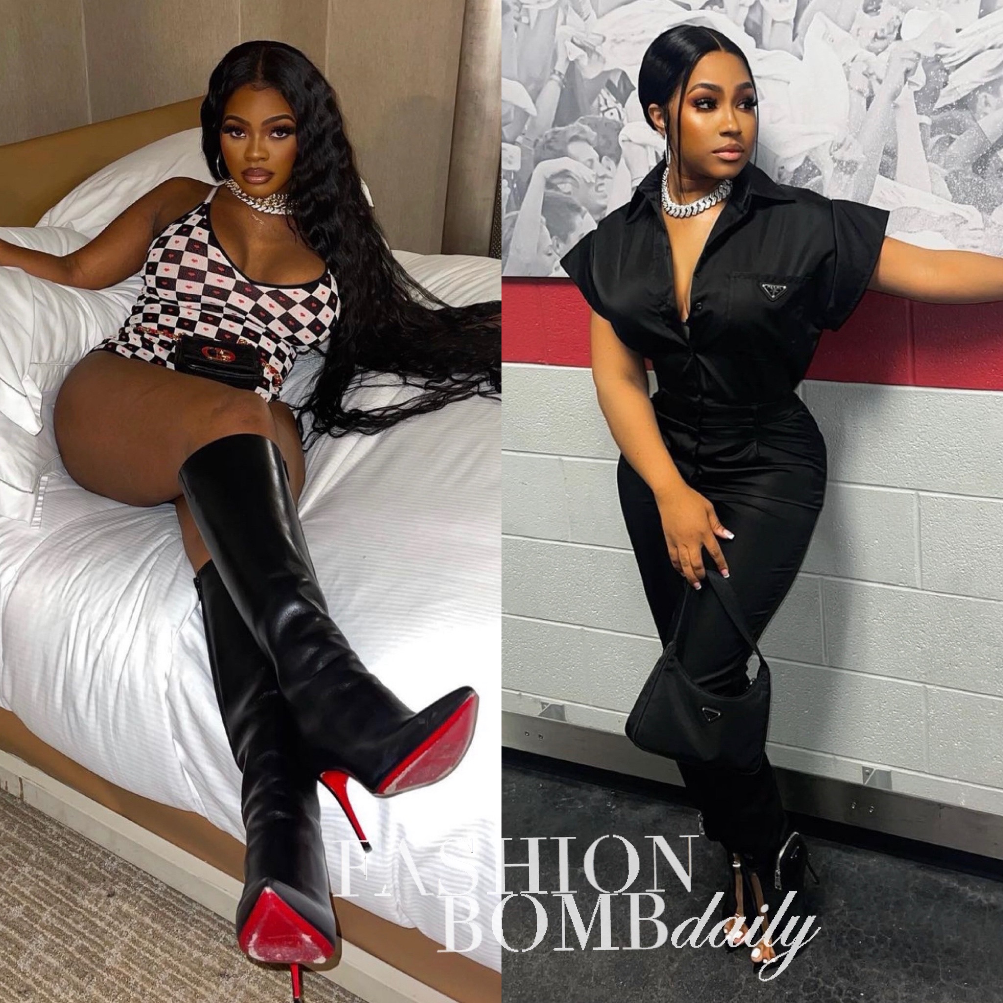 Yung Miami wore a full black Prada look including a $2,340 Re-Nylon short-sleeved jumpsuit, $410 Symbole sunglasses, and $895 Re-Nylon Re-Edition 2000 mini-bag. She also wore a pair of $1,295 Gianvito Rossi transparent panel boots which she accessorized with a Prada $460 Nappa leather mini-pouch with elasticized band around the ankle of the boots.