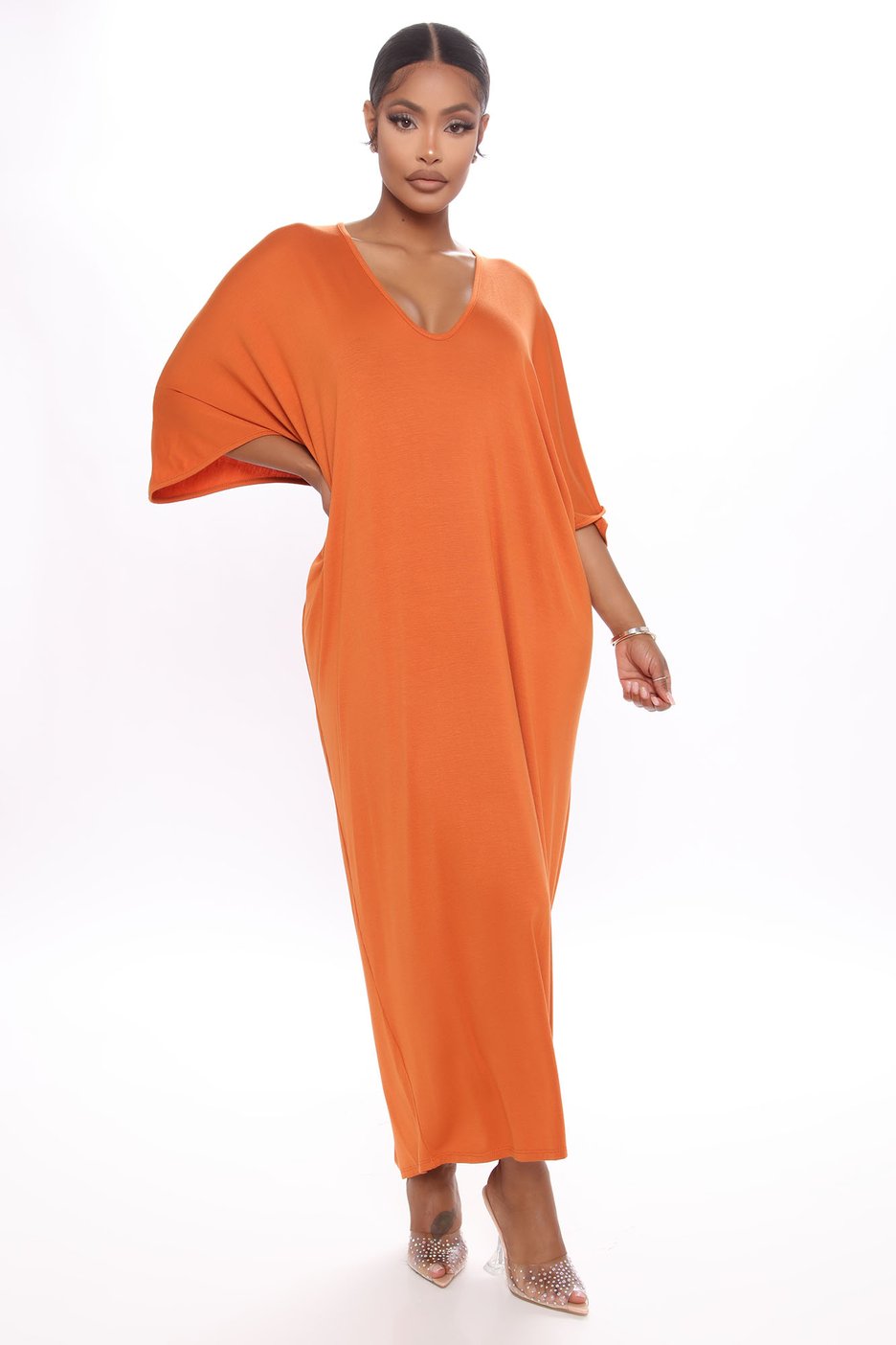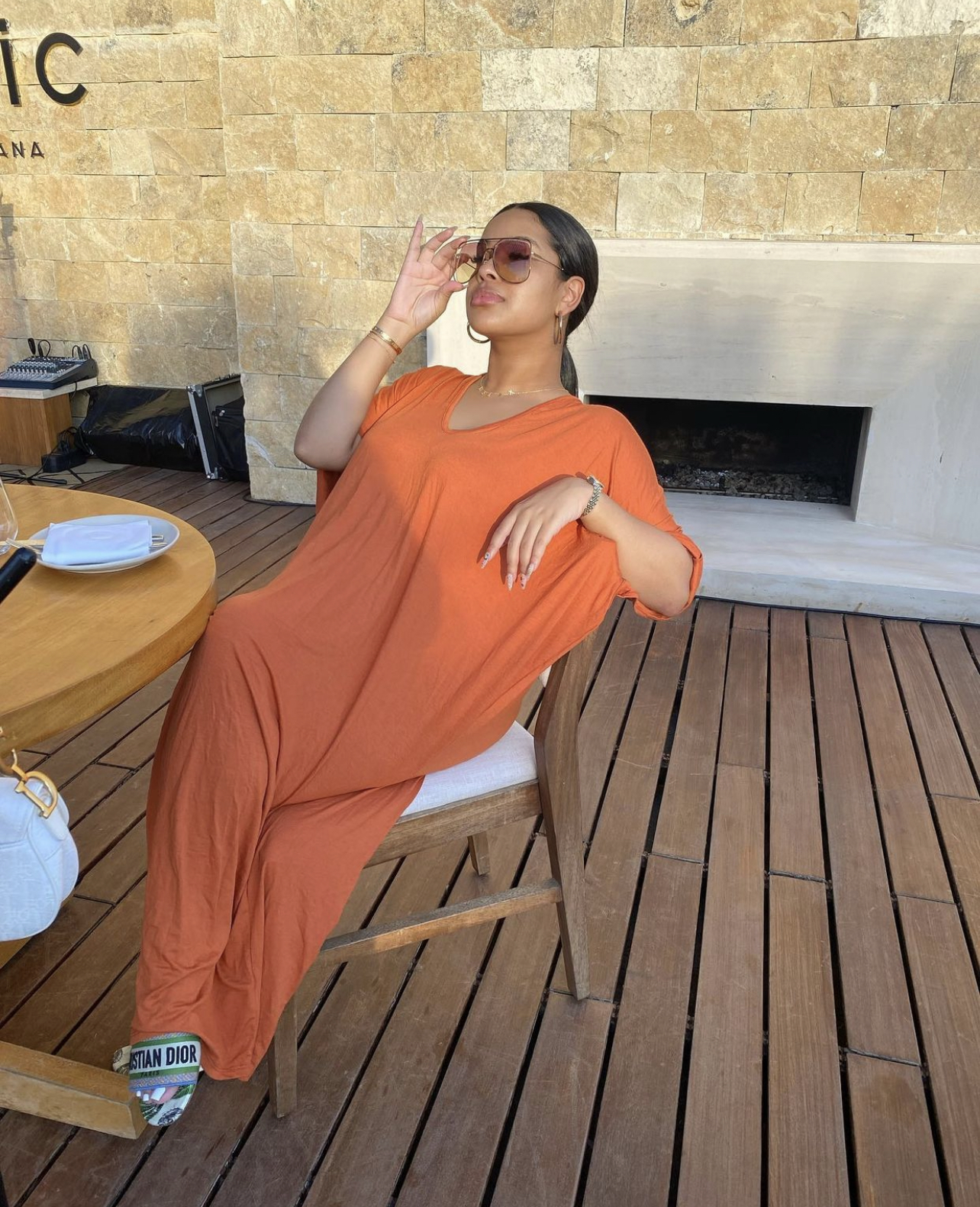 Taina Williams was spotted soaking up the sun in a comfy-looking ensemble. She was outfitted in a chic yet cozy orange v-neck maxi dress from Fashion Nova.