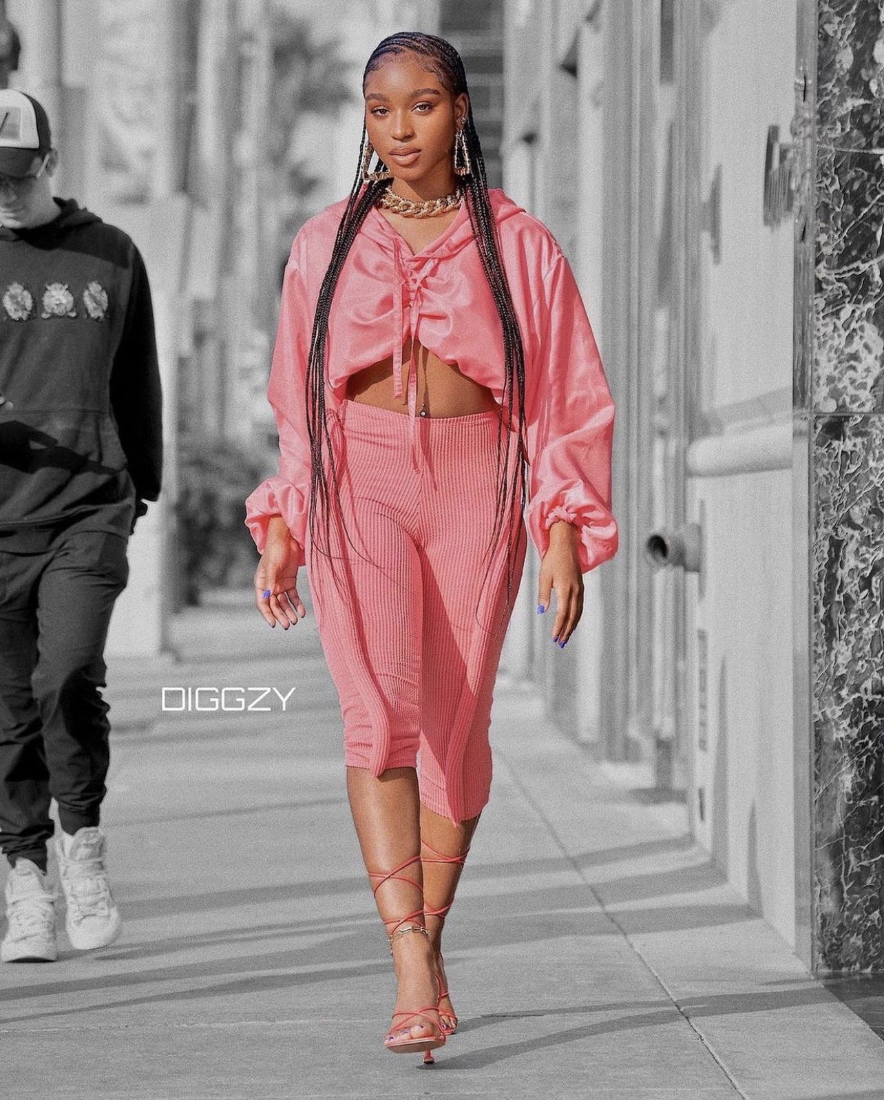 Normani was spied out treating herself to some retail therapy on Rodeo Drive and turning heads in her salmon pink look. The singer was outfitted in a pretty-in-pink athleisure look complete with strappy sandals.