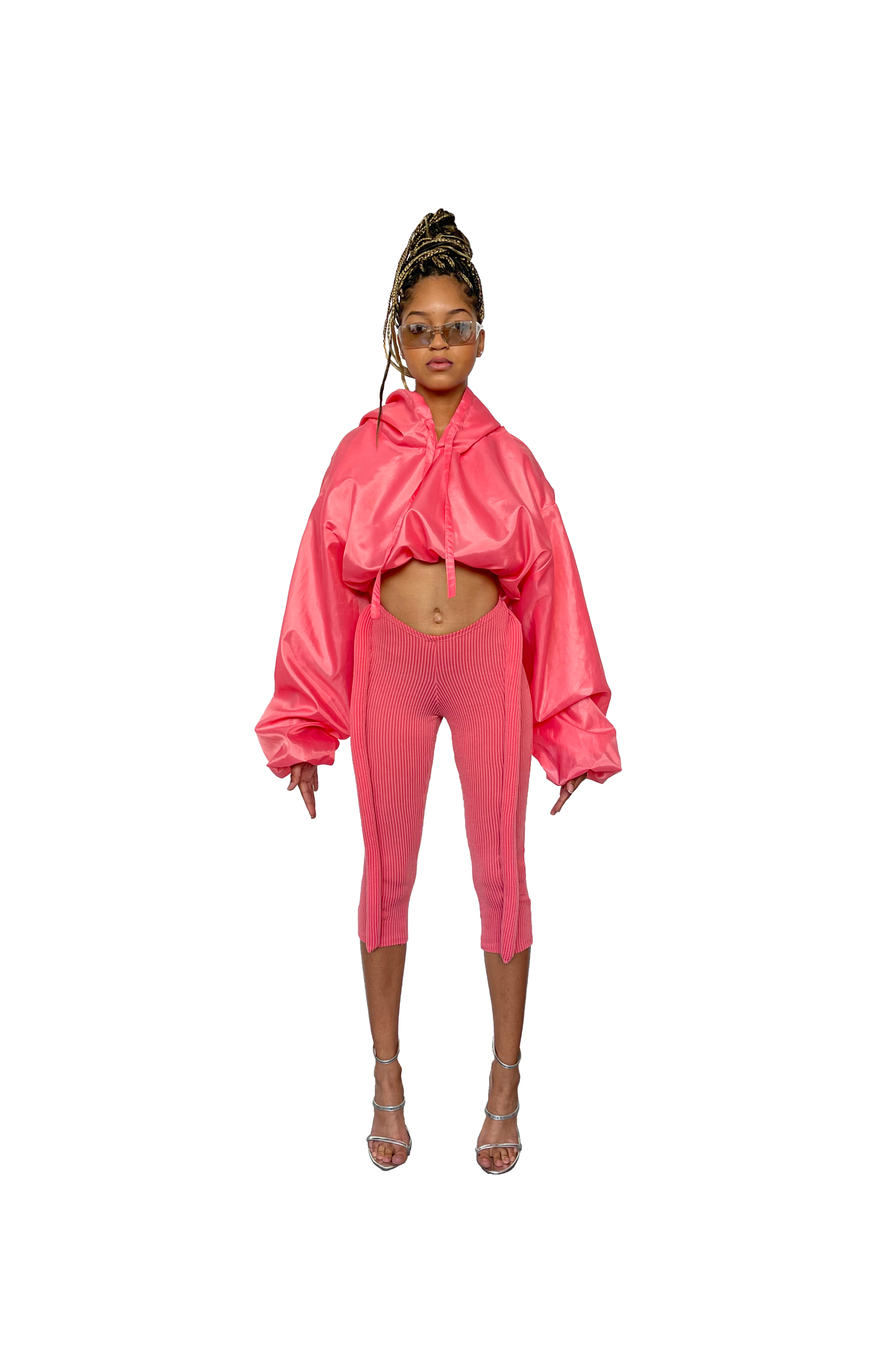 Normani wore TLZ L’Femme’s $160 cropped hoodie and $198 capri leggings, both in salmon pink. Offering a futuristic meets streetwear vibe, the set is far out from your typical athleisure with the hoodie’s oversized puffy nature along with the tube design detail on the capris. She tops off the look with gold accessories such as bamboo earrings and a chain link necklace. The “Motivation” artist also struts in a pair of pink strap heeled sandals. While blue-violet polish graces her nails, she goes with a long braided hairstyle for her hairdo.