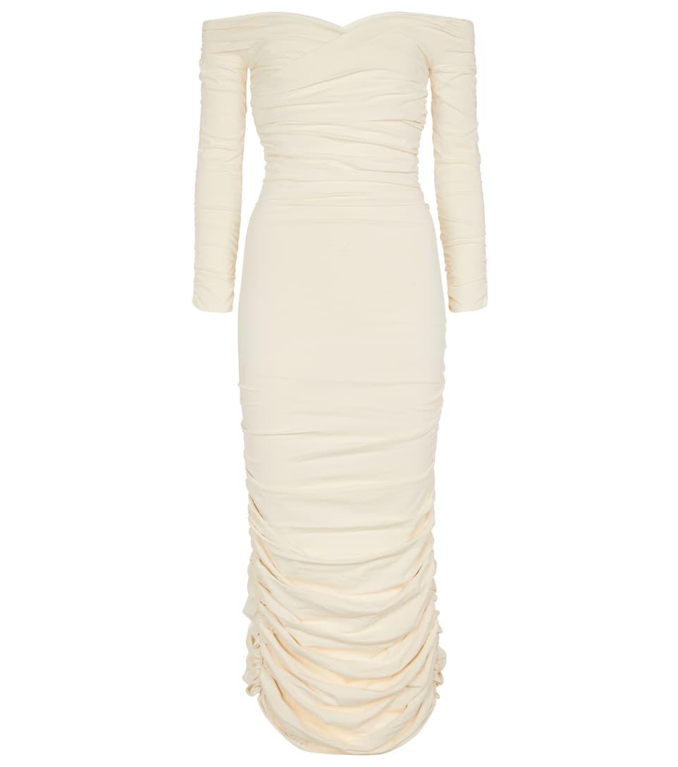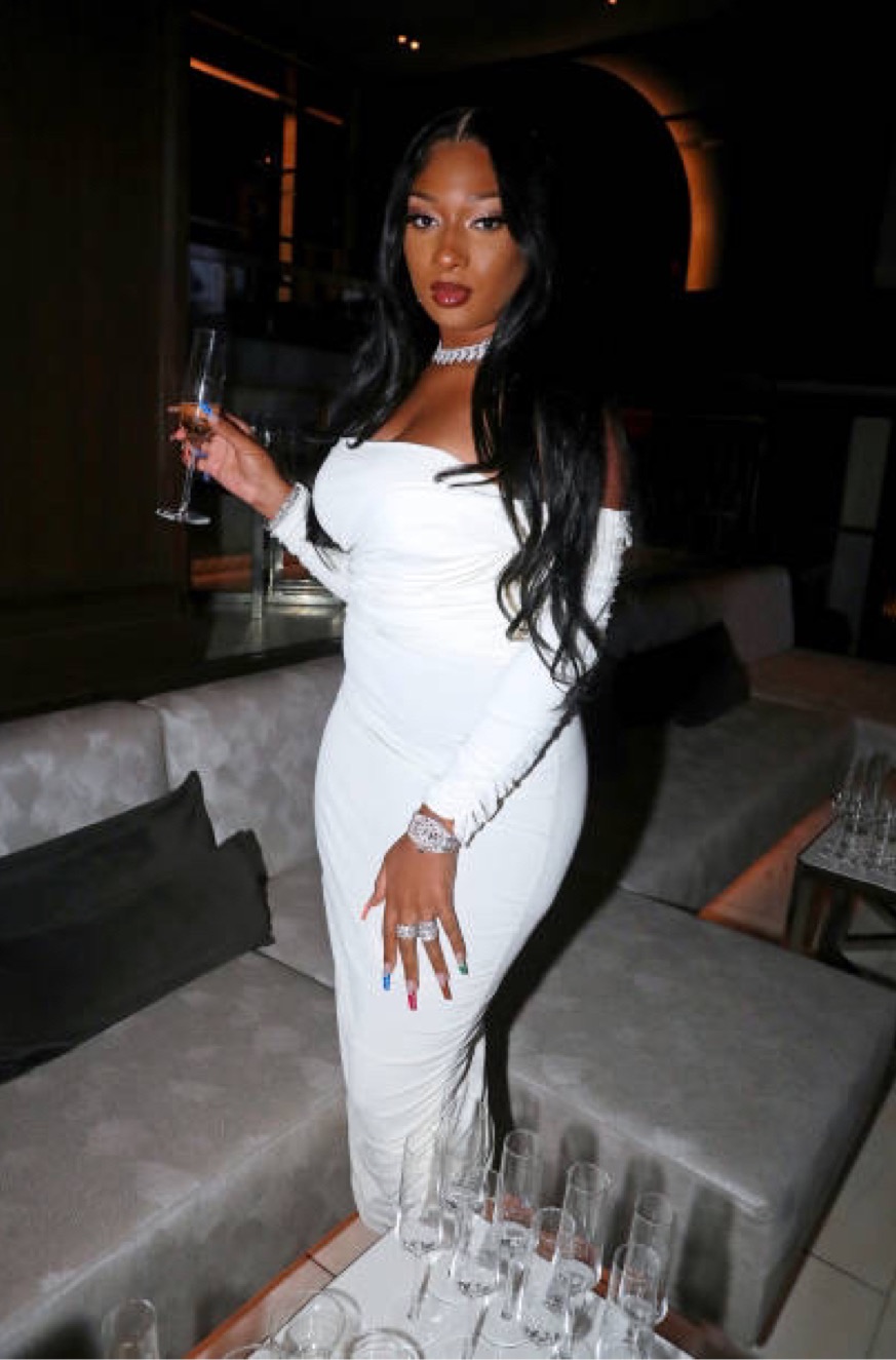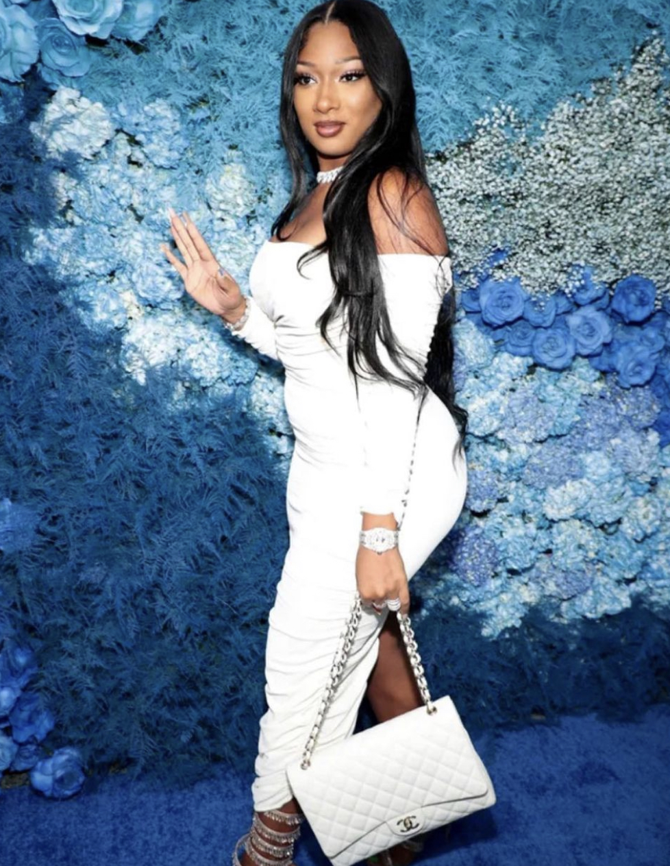 Megan Thee Stallion attended Jay-Z’s 40/40 Club anniversary party with her boyfriend Pardison Fontaine. Styled by Zerina Akers, she wore a white off-the-shoulder $2,800 Khaite “Lydia” dress paired with a white Chanel handbag and crystal fringe wraparound heeled sandals.