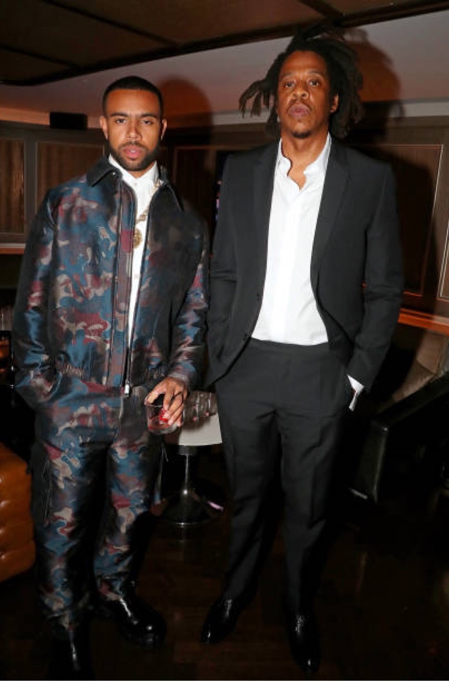 DIXSON attended the 40/40 Club anniversary party wearing a FourTwoFour by Guillermo Andrade suit paired with a Balenciaga mask, and Prada shoes, styled by Neki Bosh who is standing next to him.