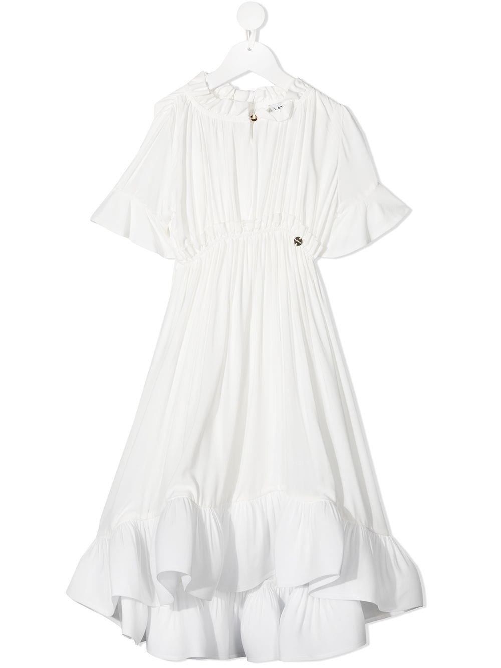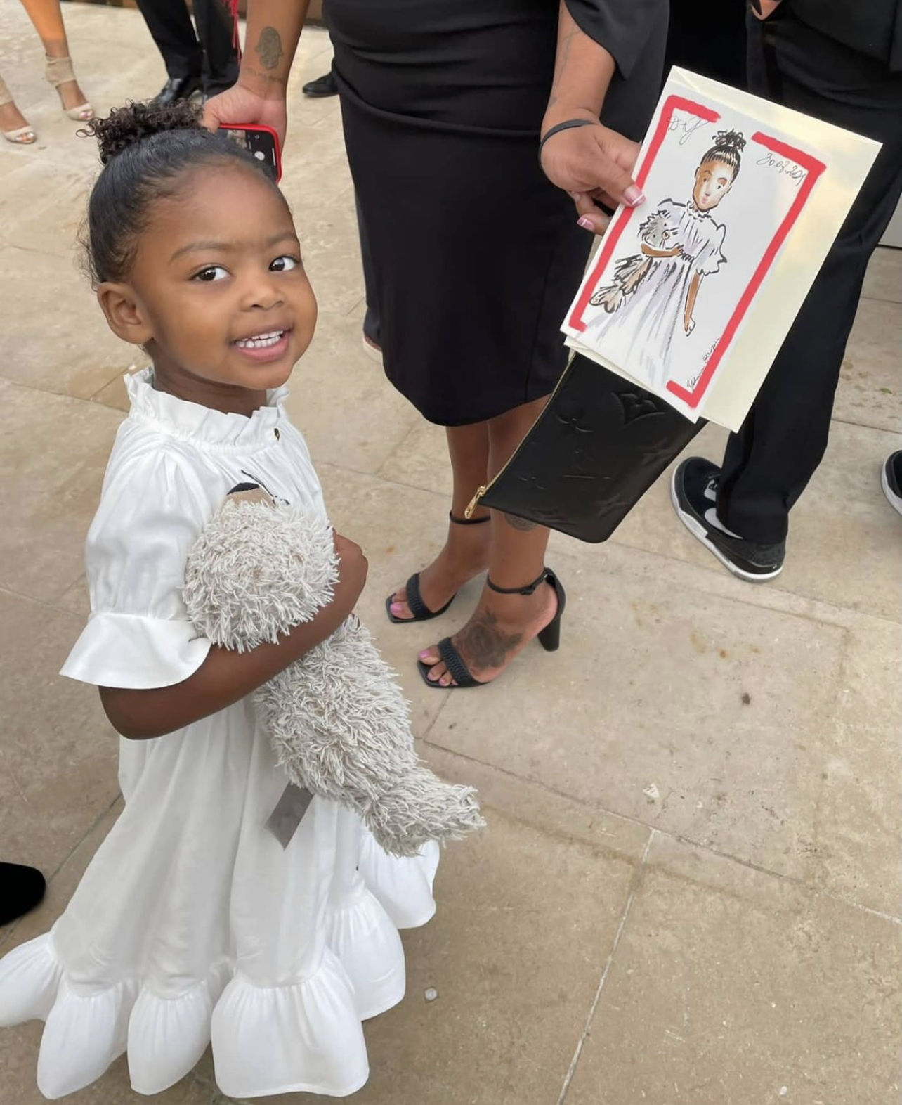Kaavia James wore Lanvin’s $669 white ruffle hem dress, which she humorously called an “emotional support dress” that gave her “confidence to steal the show” in her Instagram post. She paired the dress with $179 pink ballet flats, styled by Thomas Christos. For accessories, the little one carried her two stuffed animals.