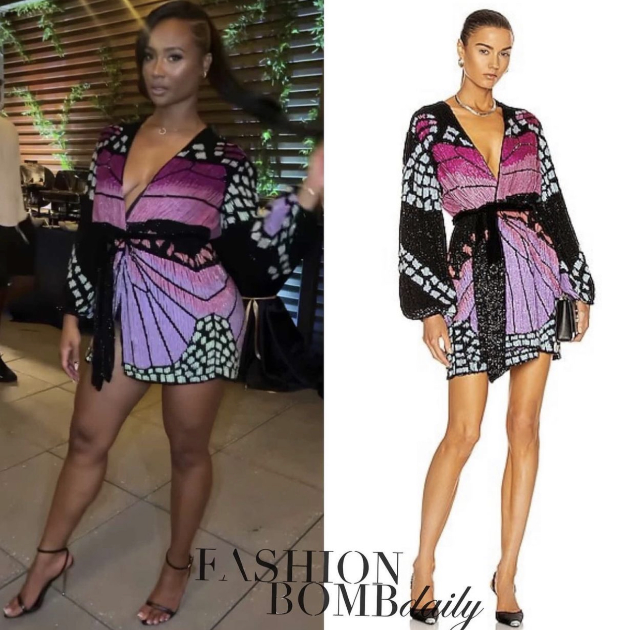 Kayla Nicole struck a pose in a $995 Retrofete “Gabrielle” Robe Dress. The wrap dress steals the show appearing with shimmering sequins which form a butterfly-inspired design. The dress also features chic balloon sleeves and a velvet self-tie belt.