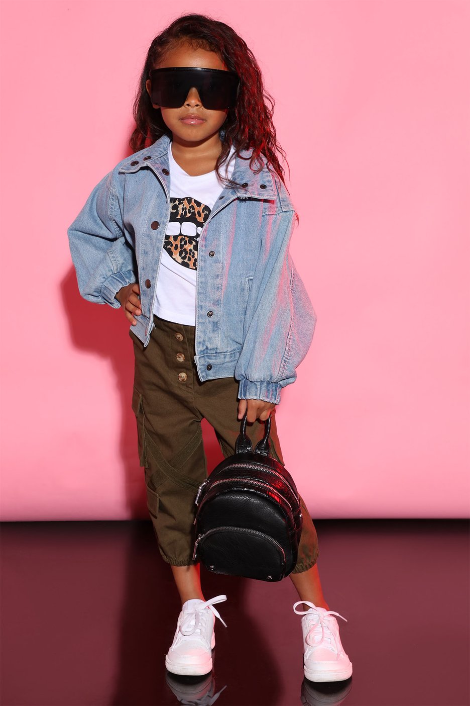 Chí Summer went with the mini version of the cargo pants, dipping into the Fashion Nova Kids line. She wore the $27.99 Mini Amelia Oversized Cargo Pants in olive as well. She paired the cargos with a black t-shirt, hoop earrings, and Air Jordan sneakers to match her mommy’s look.