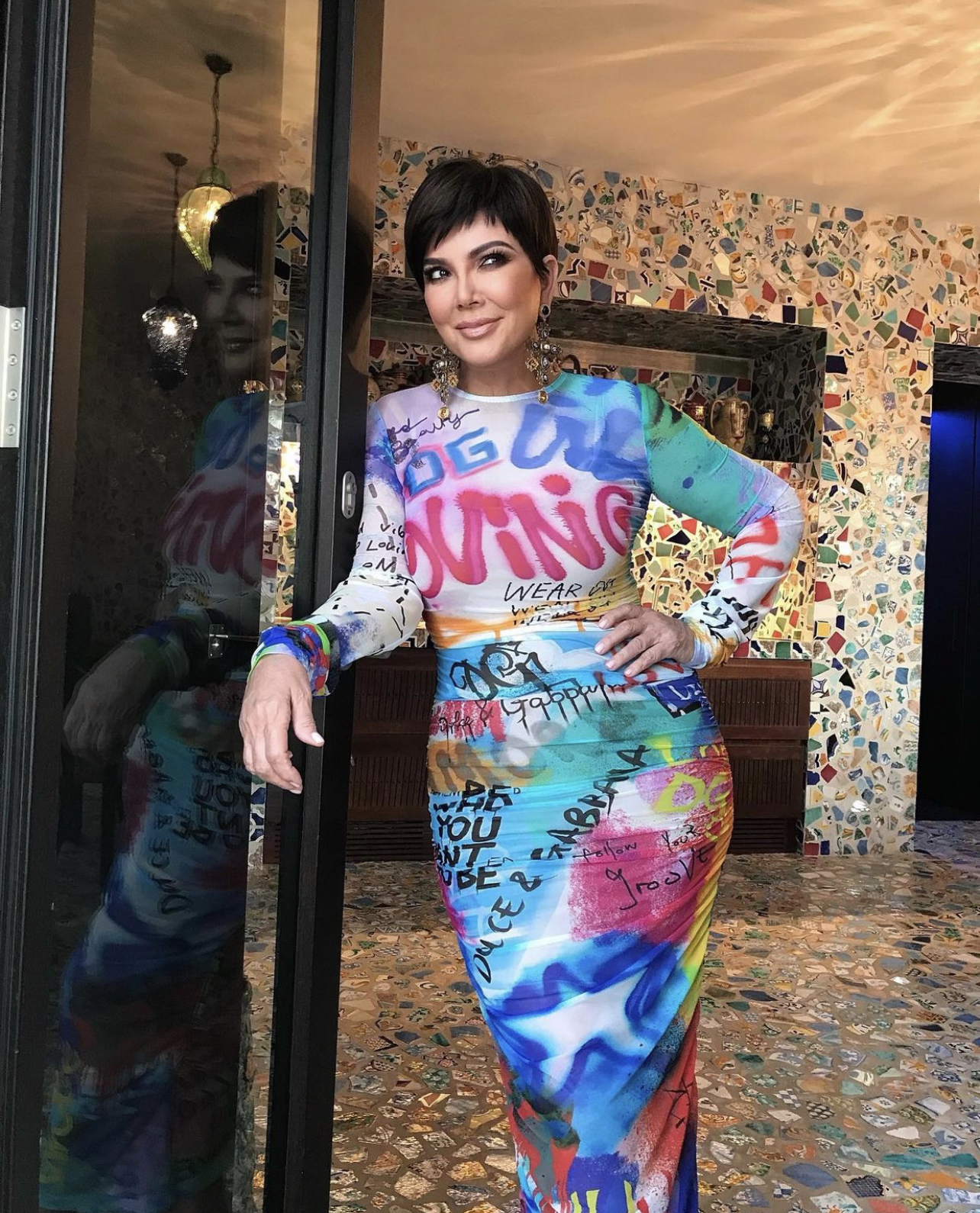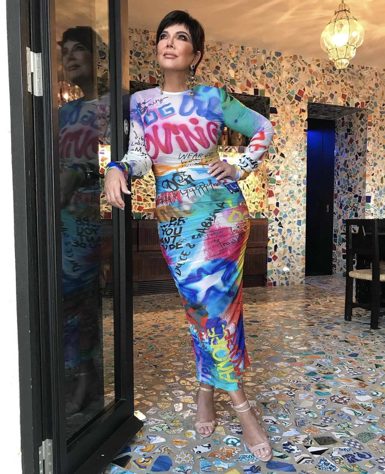 Kris Jenner struck a pose in a $2,845 Dolce and Gabbana graffiti print long sleeve midi dress from the brand’s Fall/Winter 2021 collection. Inspired by the 90s, the dress is apart of Dolce and Gabbana’s AW21 rollout and appears in a vibrant multicolor graffiti-style print in a sheer fabric. She paired the look with nude heeled sandals and dangly drop earrings.