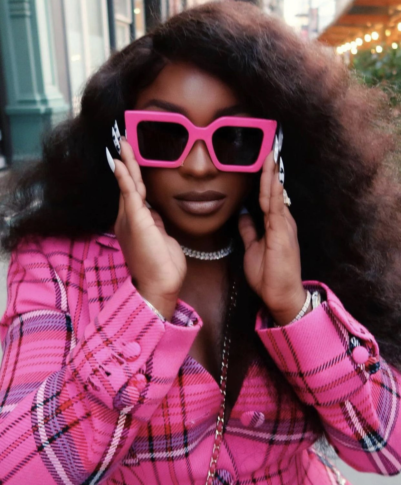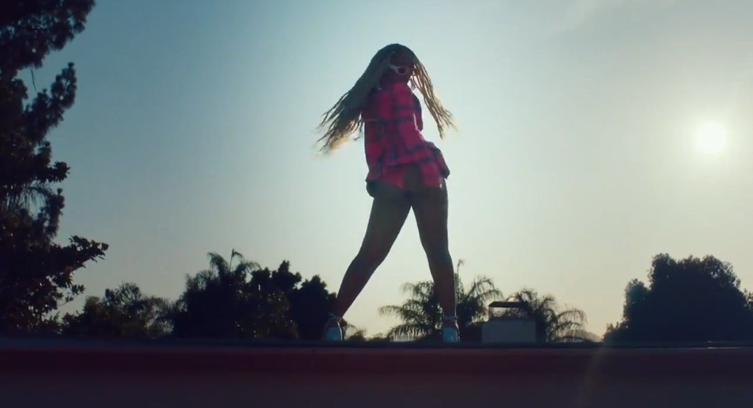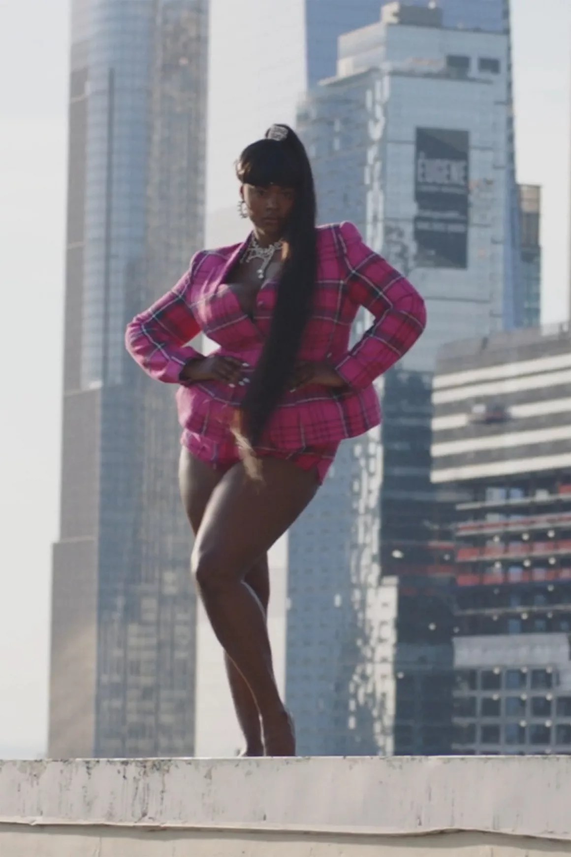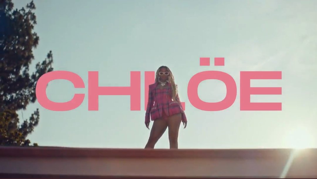 For her visual for her debut solo single “Have Mercy”, Chloe Bailey appeared in the the popular Area pink plaid blazer with what appears to be pink undergarments. She accessorized the look with white platform heels and $360 Loewe Ibiza sunglasses in pink (sold out). Her outfit was styled by Zerina Akers.
