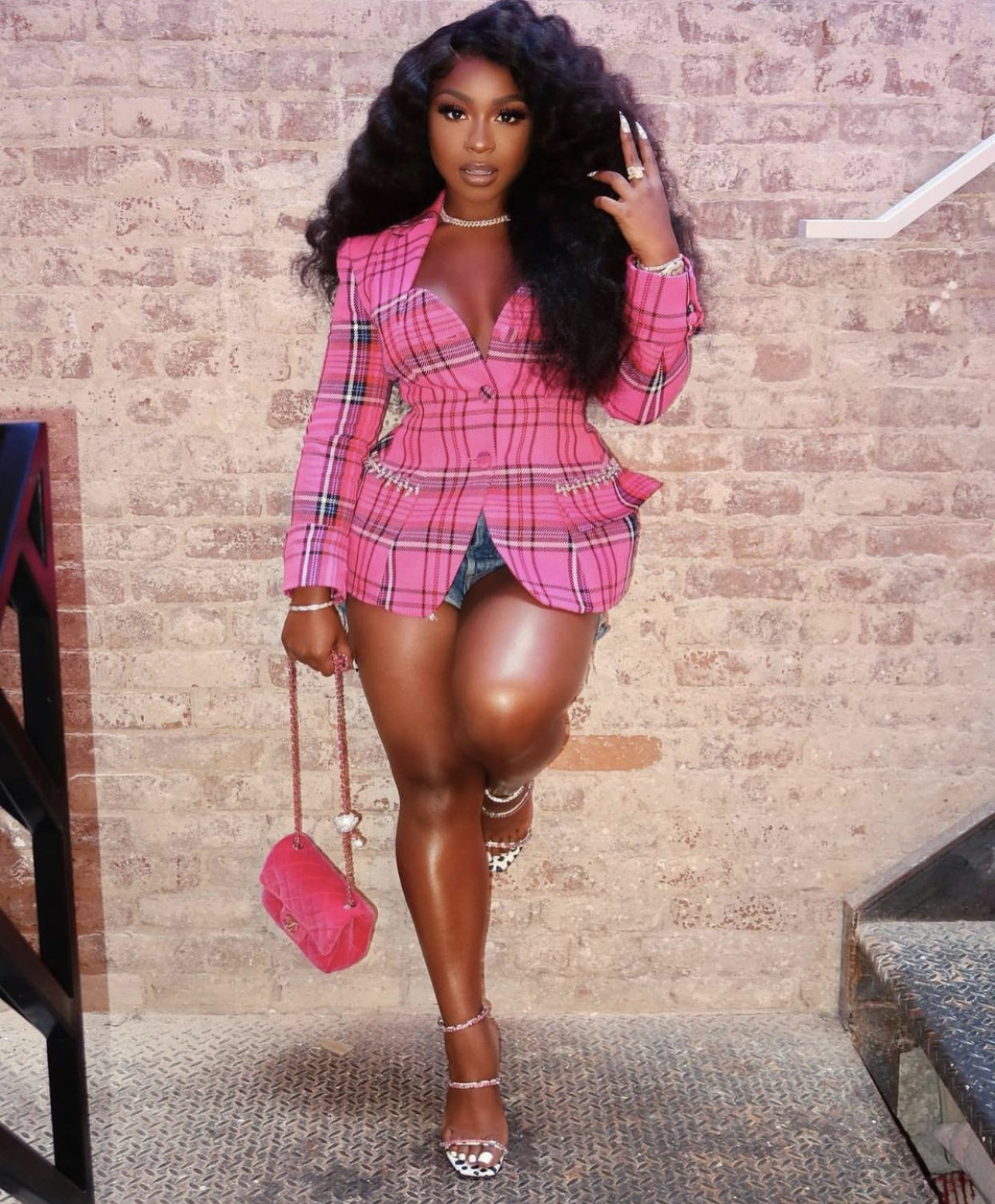 Reginae Carter wore Area’s $1,850 blazer with what appears to be denim shorts. She also opted for a Chanel pink velvet quilted mini handbag, $1,165 Amina Muaddi “Gilda” heels, and $339 Off-White pink “Catalina” sunglasses to go along with her look. For jewelry, she went with a choker necklace, bracelets, and rings. Reginae’s look was styled by Jeremy Haynes.