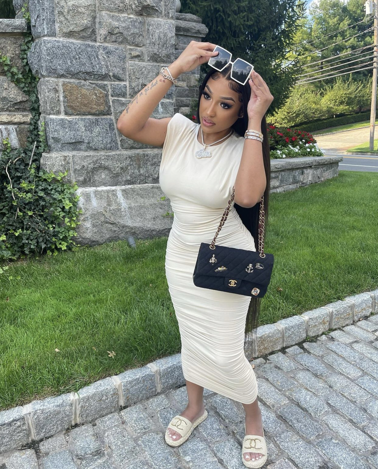 Ella Rodriguez wore the $44.99 One And Only Shoulder Pad Midi Dress from the popular fashion retailer. She decided to compliment the cream vibes of her dress with her accessories. The young entrepreneur accessorized her look with oversized sunglasses and Chanel pieces including a quilted chain handbag and slide sandals. She also went with icy jewelry pieces such as bracelets, necklace, and stud earrings.