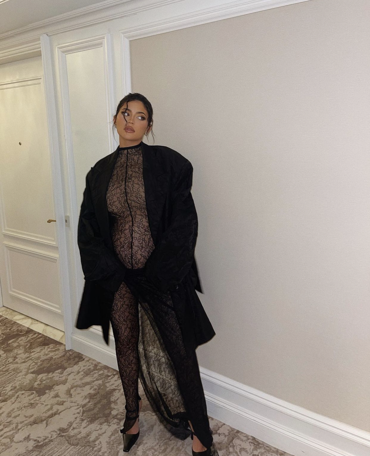 Does this look seem familiar? Kylie Jenner seems to have borrowed some maternity style inspiration from her sister Kim Kardashian who wore a similar black lace look while pregnant with her son Chicago. While attending the LACMA in 2015, the SKIMS founder wore a black lace jumpsuit paired with a longline blazer jacket by Givenchy under Riccardo Tisci.
