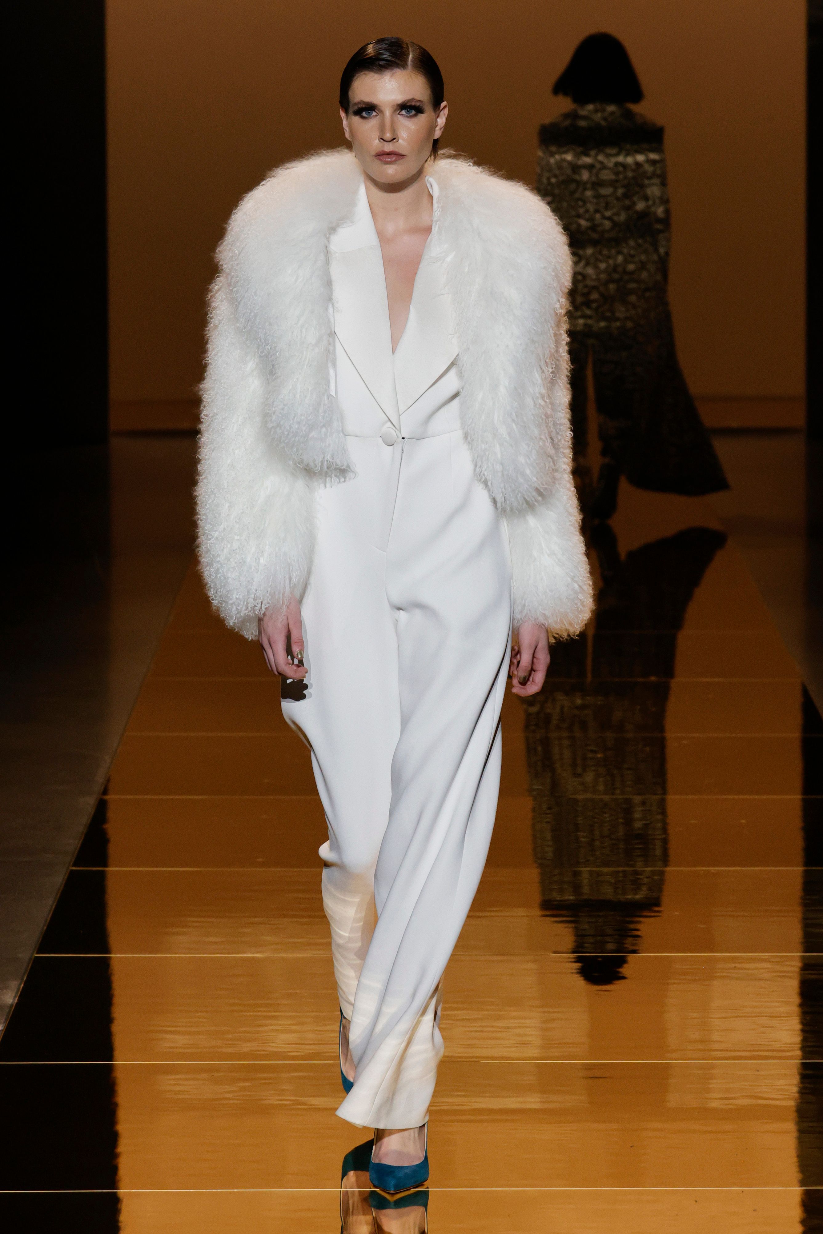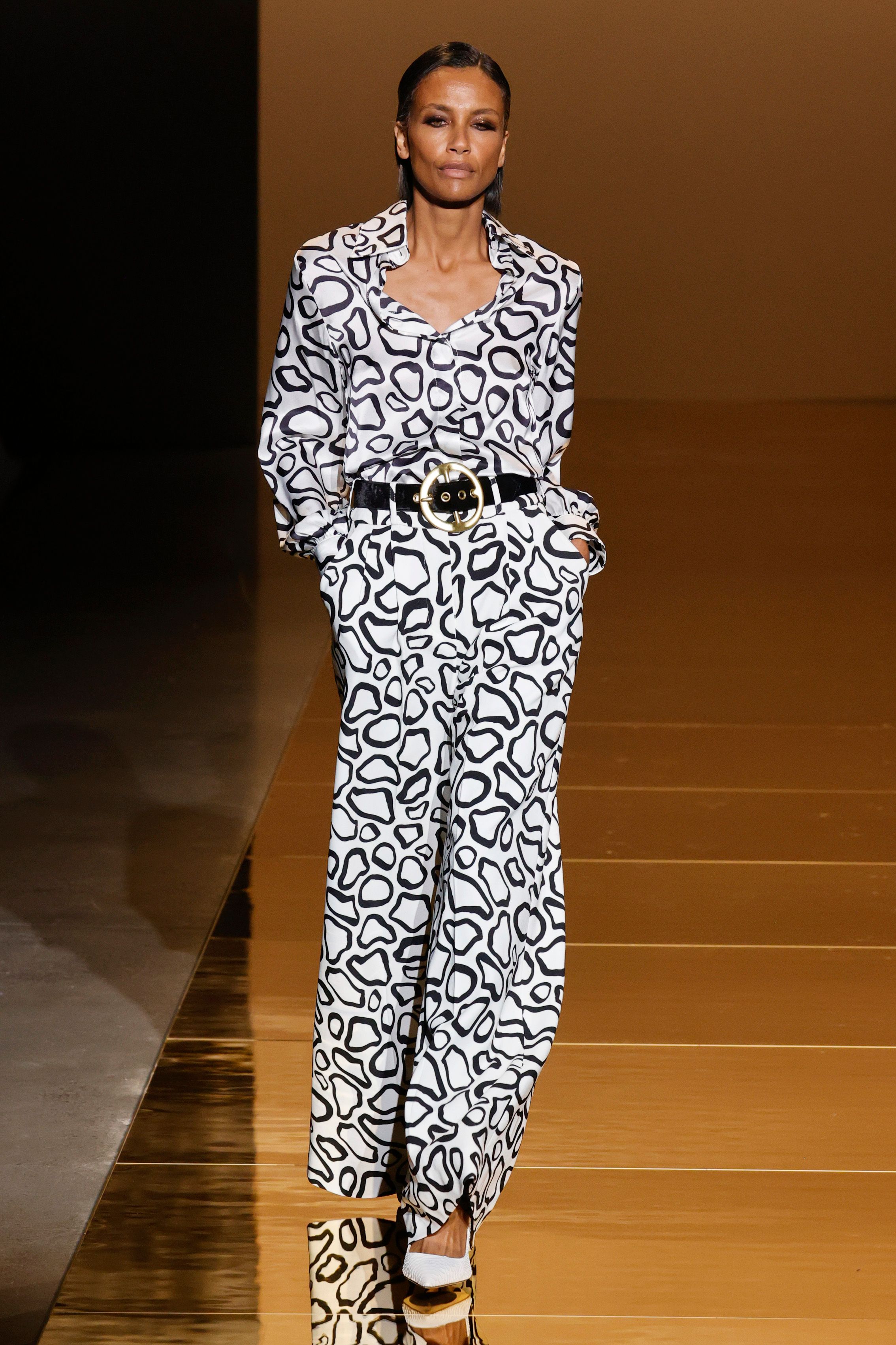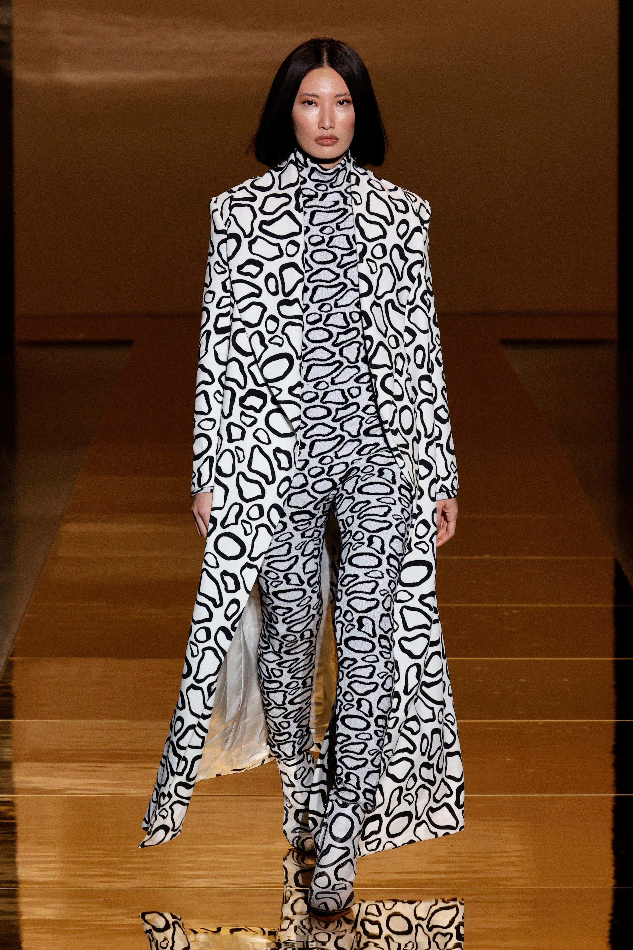 Sergio Hudson found inspiration in many areas including the continent of Africa. A bold abstract black and white print appears on a trench coat with a unitard to match. Continuing the use of the spirited print, it can also be seen on a midi dress and knee high boots which are rounded off by a fierce black fur jacket.