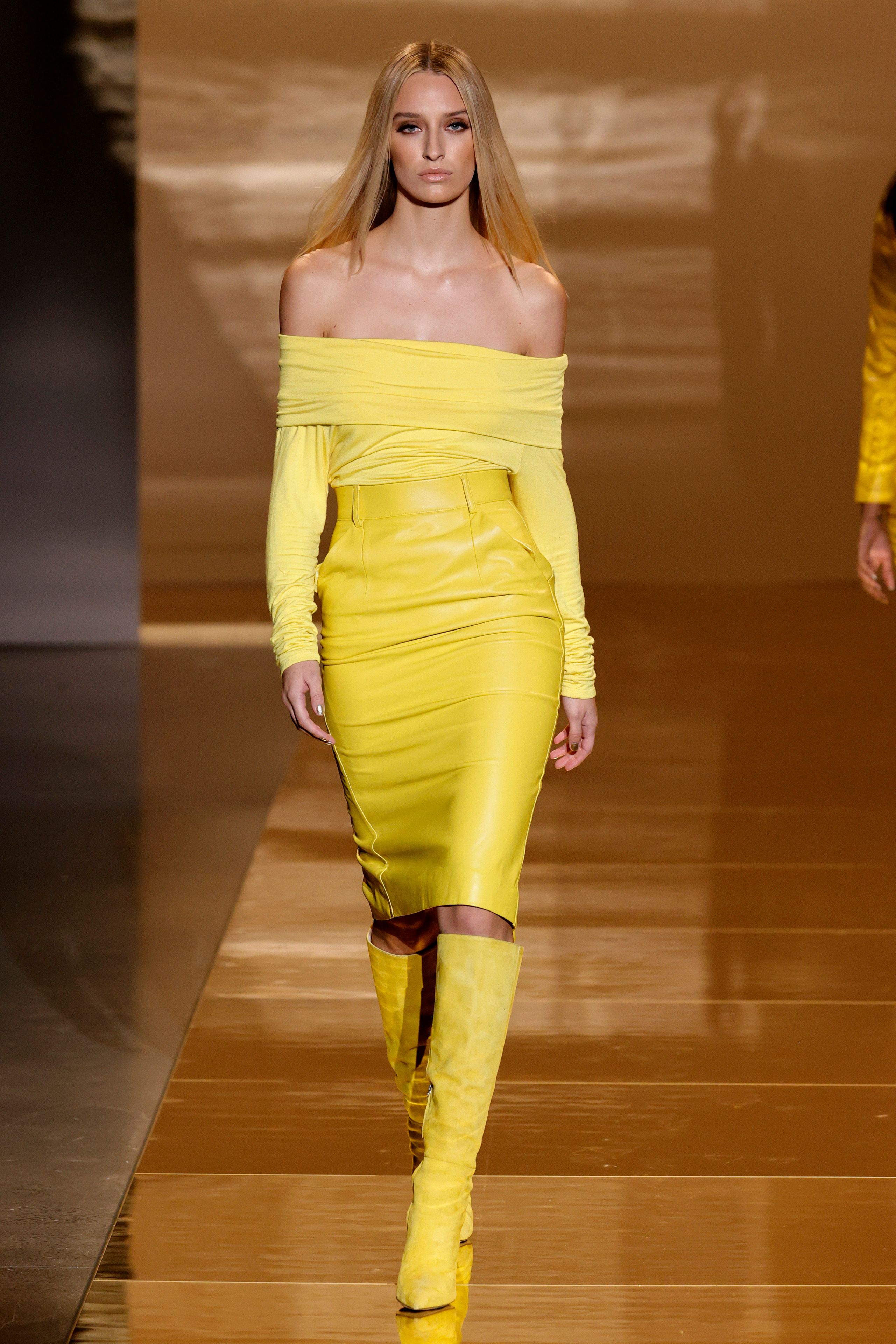 Additionally, the label collaborated with footwear brand Brother Vellies for shoes to match the singular-hue looks. Footwear included pumps, ankle boots, and knee high boots adorned with intricate embellishments such as ribbons, laces, and crystals.