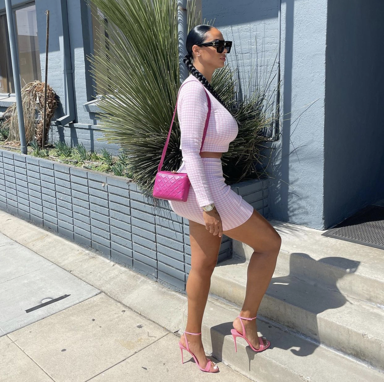 Johanna Leia was spotted giving us a pretty-in-pink style moment recently! The basketball mom was spied posing in a stylish Fashion Nova long sleeve crop top and mini skirt set paired with pink accessories.