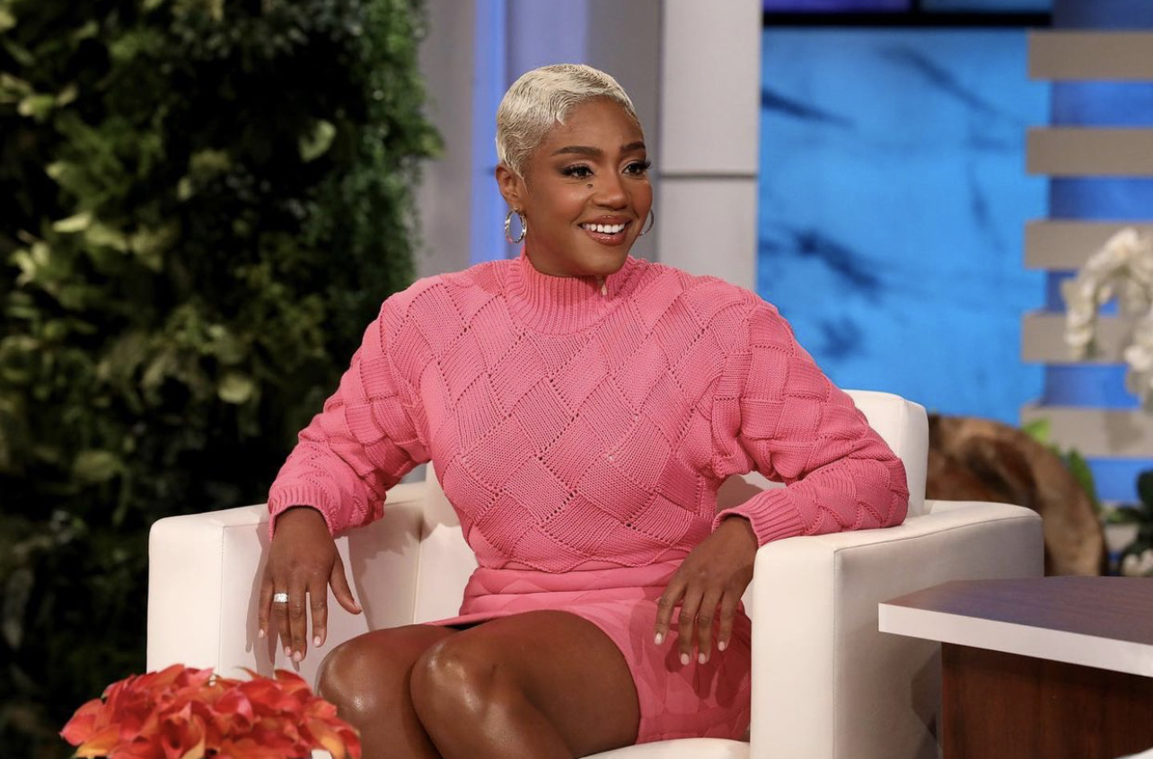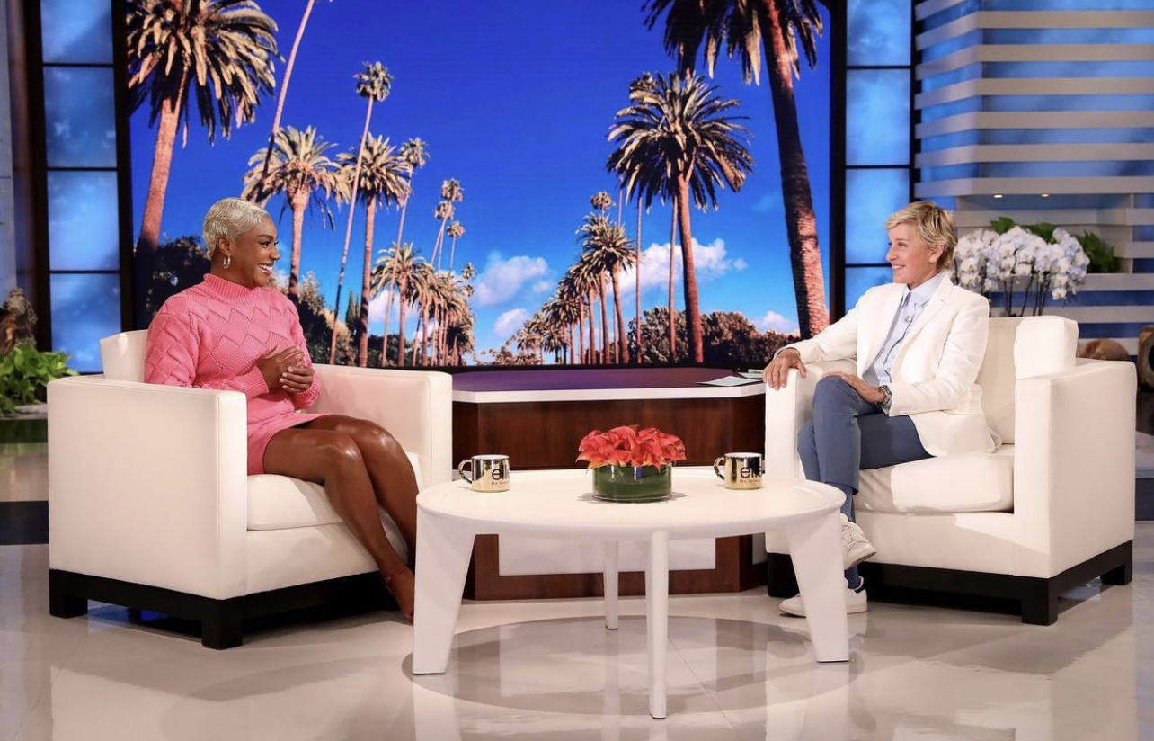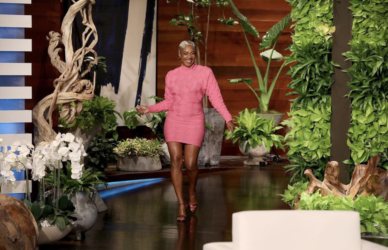 Tiffany Haddish continues to show us that “she ready” when it comes to anything she does. The comedian appeared on Ellen DeGeneres’ daytime show wearing a $1,390 Herve Leger mixed-media woven bandage dress. The turtleneck mini dress consists of a bandage-rib knit combination which is woven to present a intertwining design in a vibrant pink color. Styled by Law Roach, she also opted for pink metallic heeled sandals and hoop earrings to accompany her stylish look.