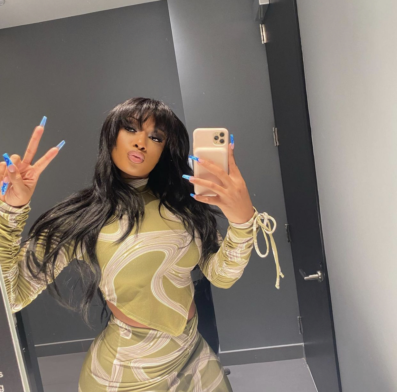 Megan Thee Stallion Shows Off New Bang Hairstyle Wearing Fashion Nova Green Maxi Skirt Set