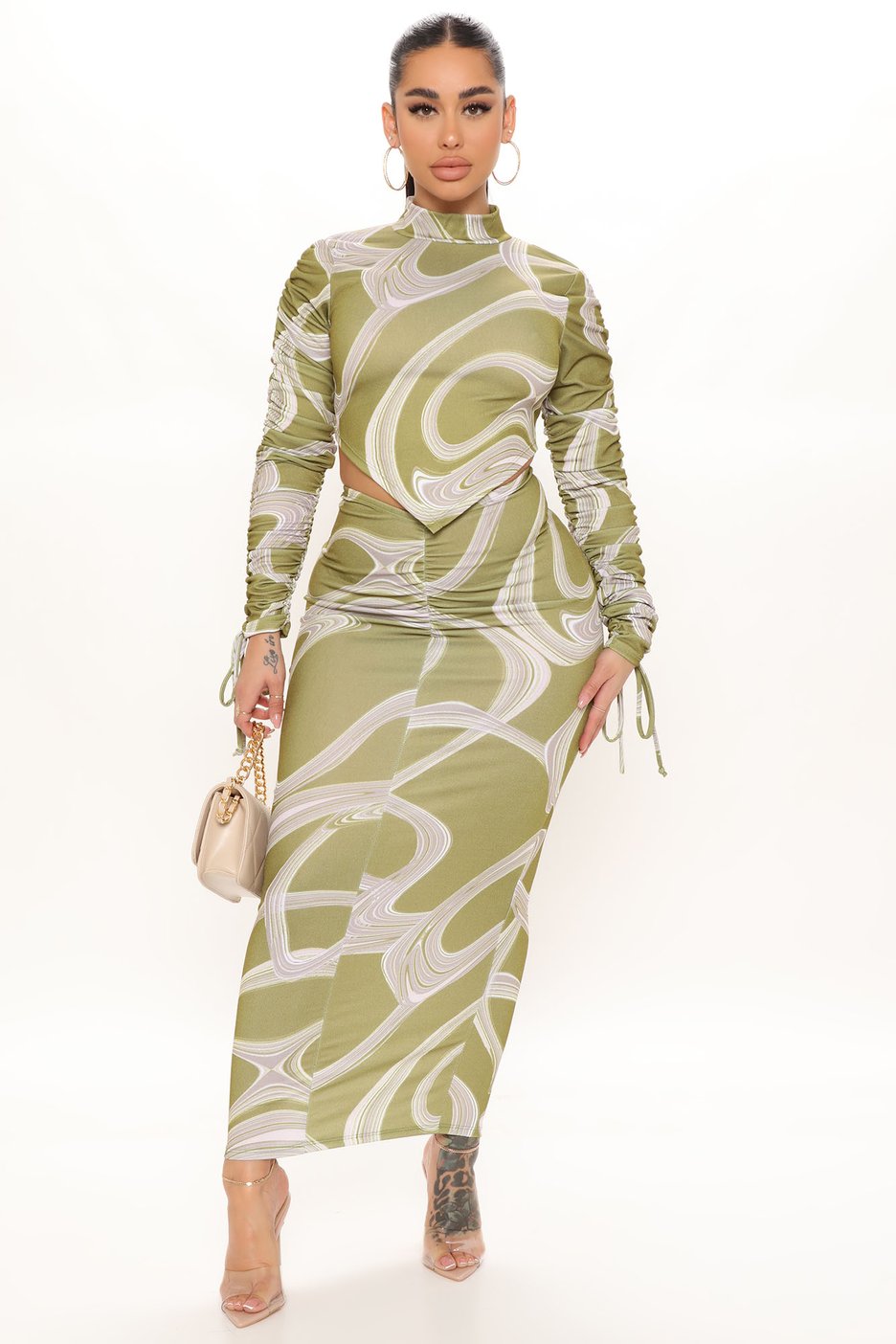 The Take A Dip Skirt Set features a mock neck long sleeve crop top and maxi skirt in an allover swirly abstract print. The top also appears with a stylish v-style hem in the front along with ruched sleeves and tie details. Not to mention, the set also comes in another colorway known as rust/combo.