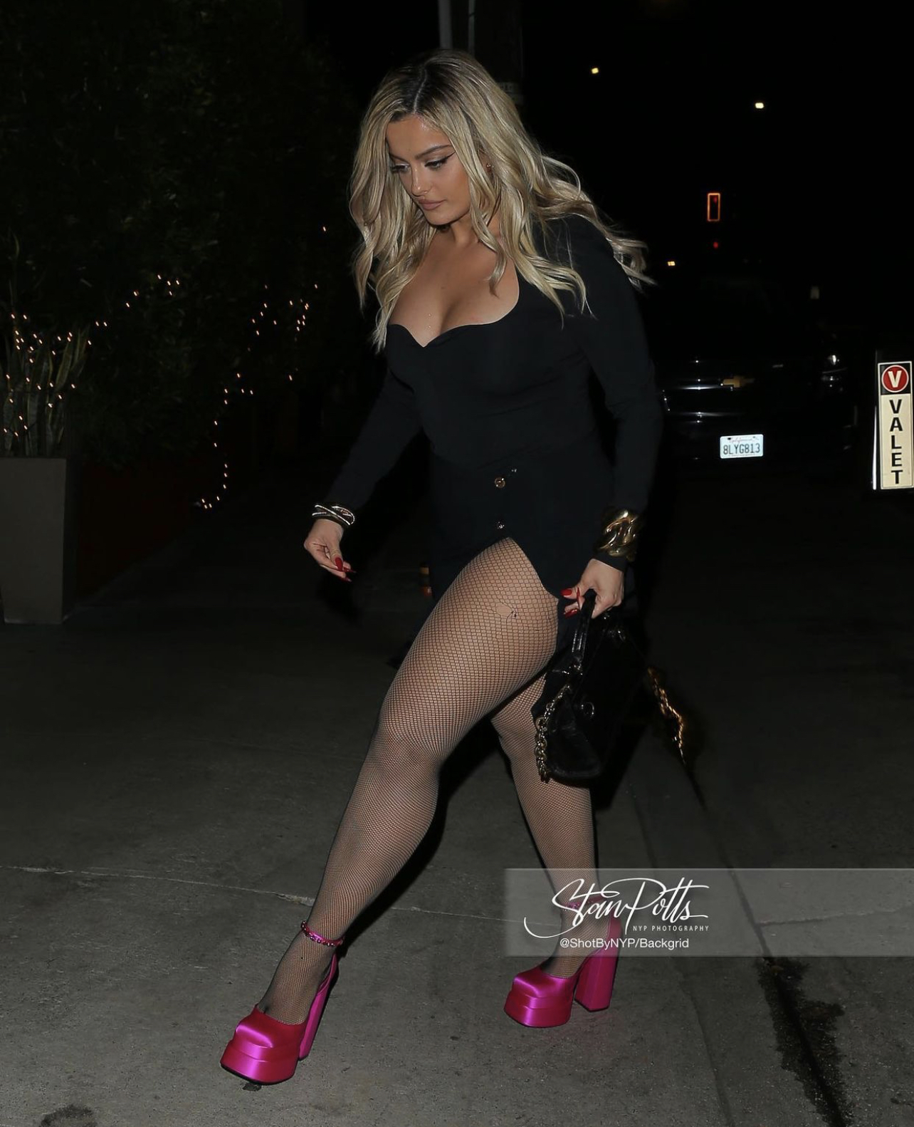 Bebe Rexha was spied out in Santa Monica attending a birthday dinner with her friends at Giorgio Baldi. For her dinner ensemble, she wore what appears to be the $895 Versace black sweetheart-neckline bodysuit and ruffled buttoned mini skirt. She finished the look with the $1,295 Versace pink satin platforms. The music artist also wore gold jewelry pieces to accompany the look.
