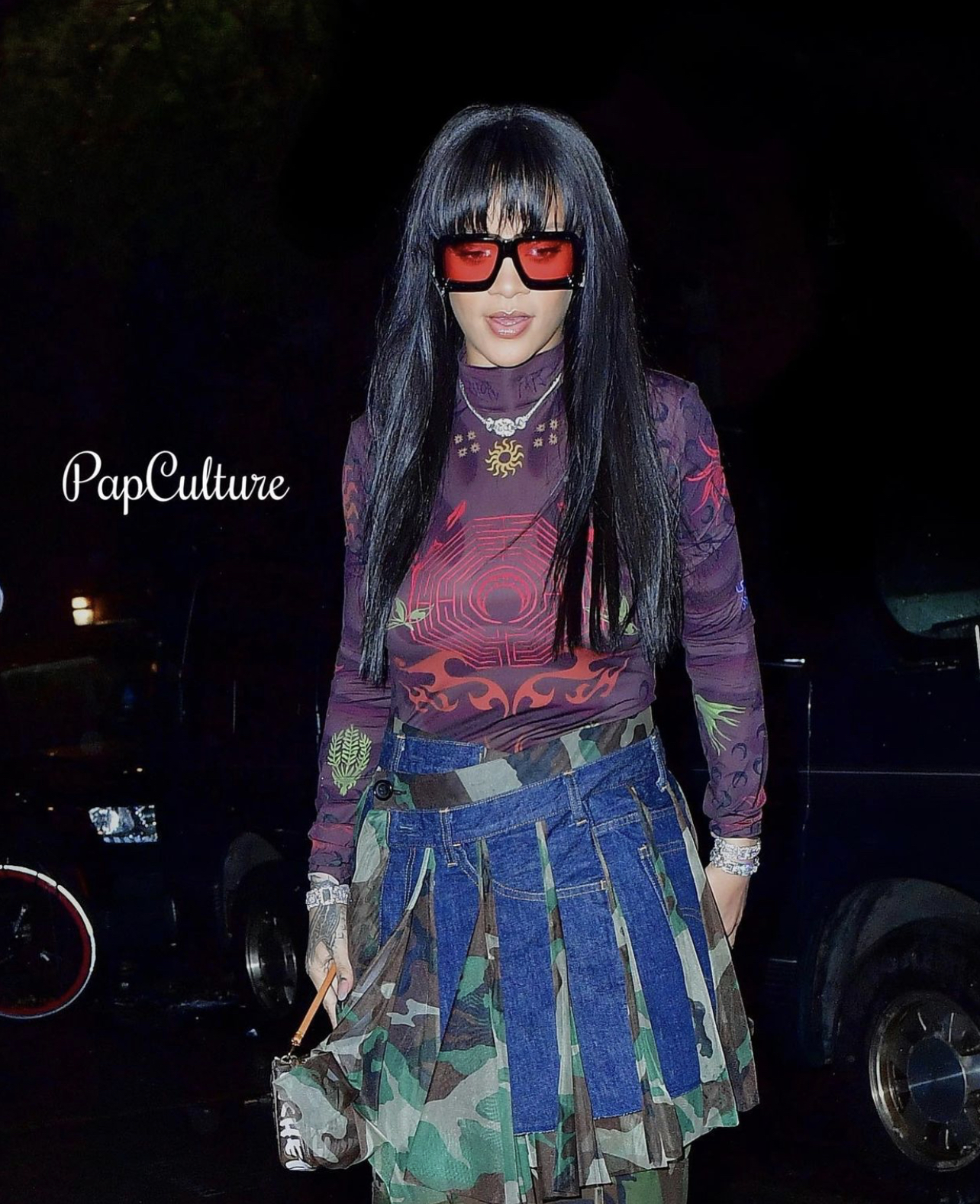 Giving us a sort of punk-style look, Rihanna was spotted in the $430 Marine Serre Punk Shaded Second Skin Tattoo top which she coordinated with a camo skirt-pants combo. The Savage X Fenty CEO wore a Junya Watanabe Fall 2021 camo and denim pleated skirt over a pair of Matthew Adams Dolan 2015 camouflage cargo pants. Rihanna lived by those cargo trousers in 2015 as she was spotted in them throughout the stated year.