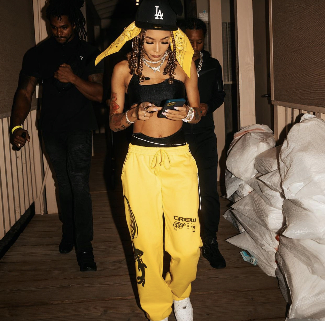Coi Leray paired the look with a pair of yellow graphic sweatpants and white Nike Air Force 1 Low sneakers. She also rocked a yellow bandana on her head, which peeked from under her black LA Dodgers fitted cap. She also kept it icy with jewelry pieces such as bracelets, a watch, and a butterfly pendant necklace.