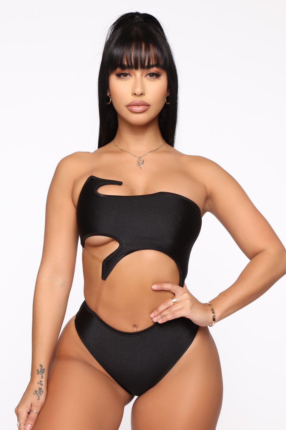 Coi Leray wore Fashion Nova’s $32.99 Cut You Off Bodysuit in black. The bodysuit appears in a unique cutout design with clear straps to hold the top in place as well as provide the illusion of an unconventional shape.