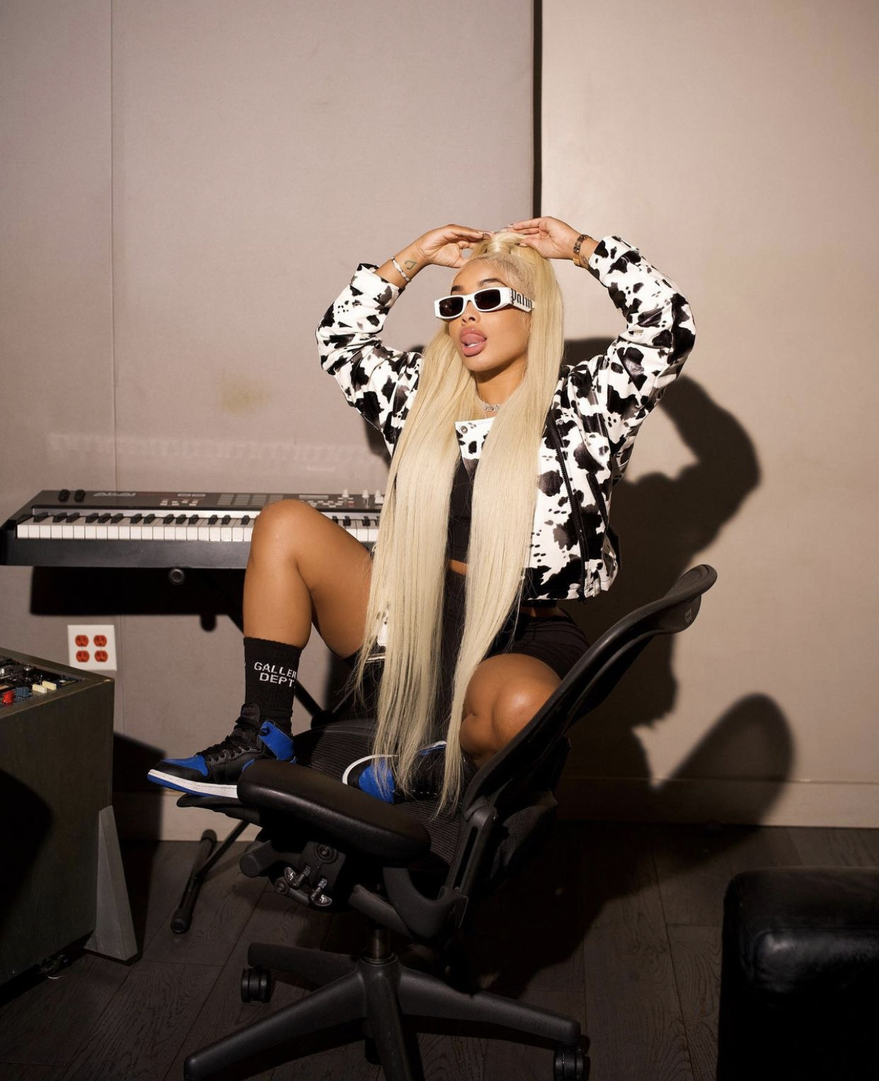 DreamDoll opted for a cozy, stylish look wearing Fashion Nova’s $79.99 Making Bad Moooves Cow Print Moto Jacket. She paired the look with what appears to be a black crop top and biker shorts along with black Gallery Department logo socks and Air Jordan 1 “Royal” sneakers. She also accessorized the look with white Palm Angels sunglasses and a blue Telfar shopping bag.