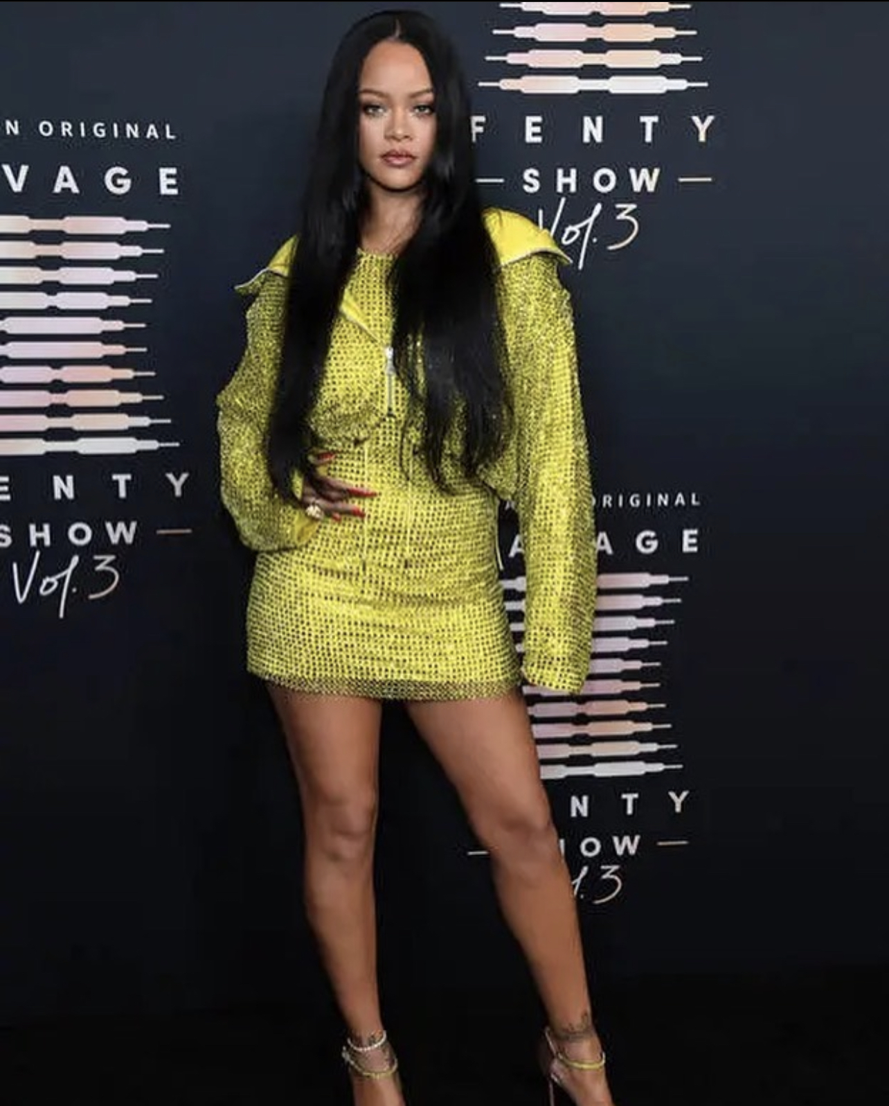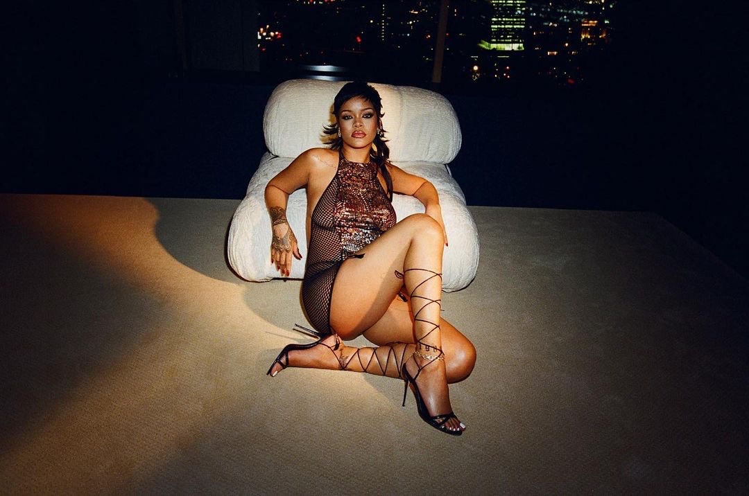 Rihanna wore a Maison Margiela black long slit dress, circa 2000, paired with Savage x Fenty pieces including thigh high stockings and a garter set. She completed the look with Amina Muaddi “Dalida” mules. Rih’s looks for the show were styled by Jahleel Weaver.