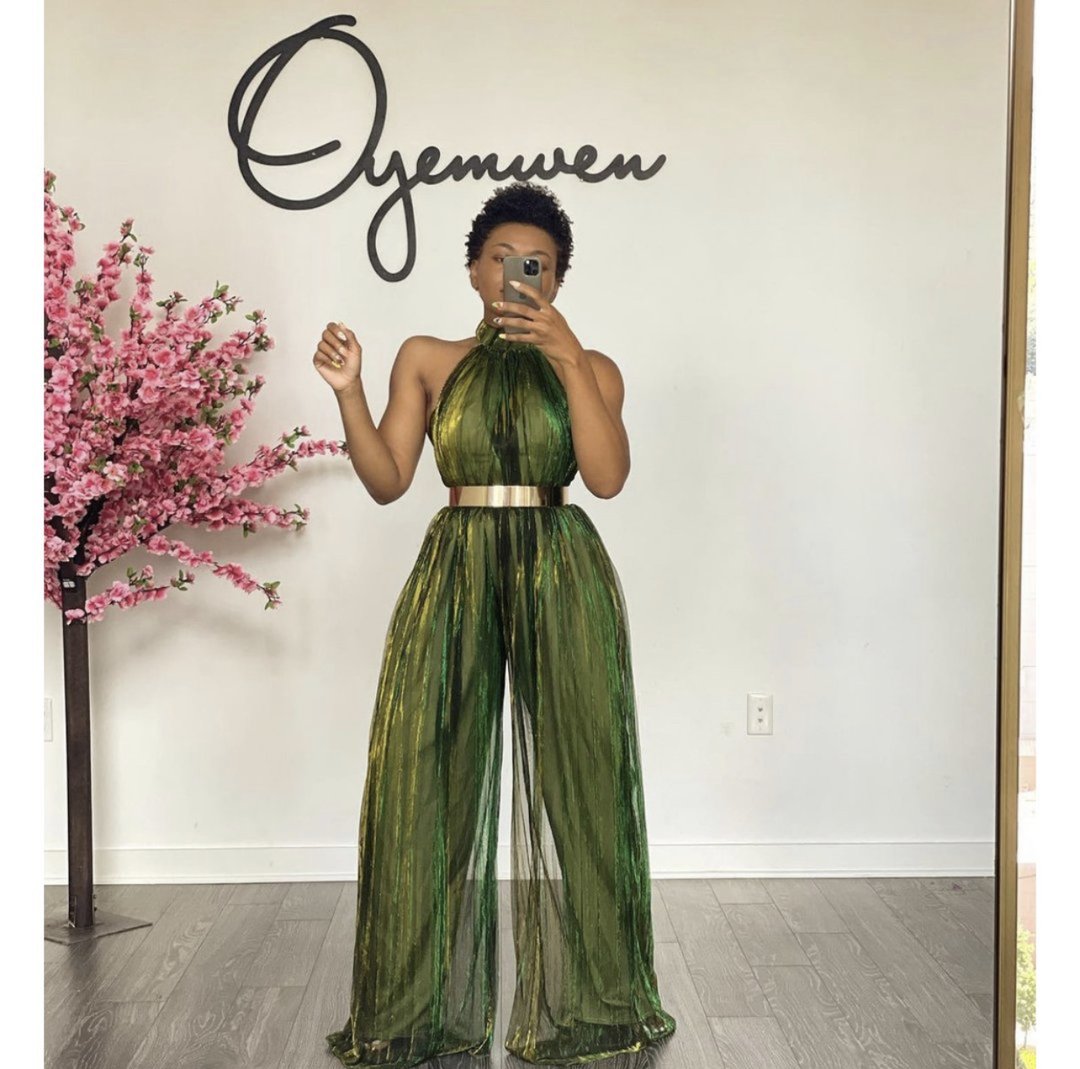As for the jumpsuit, it is definitely a stunner to be worn in confidence, as perfectly executed by LaChanze. The Forbidden Garden Green Wide Legged Jumpsuit by Oyemwen appears in an olive green color complete with a sheer overlay striped with various shimmering shades of green. It also features a chic halterneck detail along with fashion-forward wide pants legs and a zipper closure. This particular piece is custom made with sizes ranging up 5X.