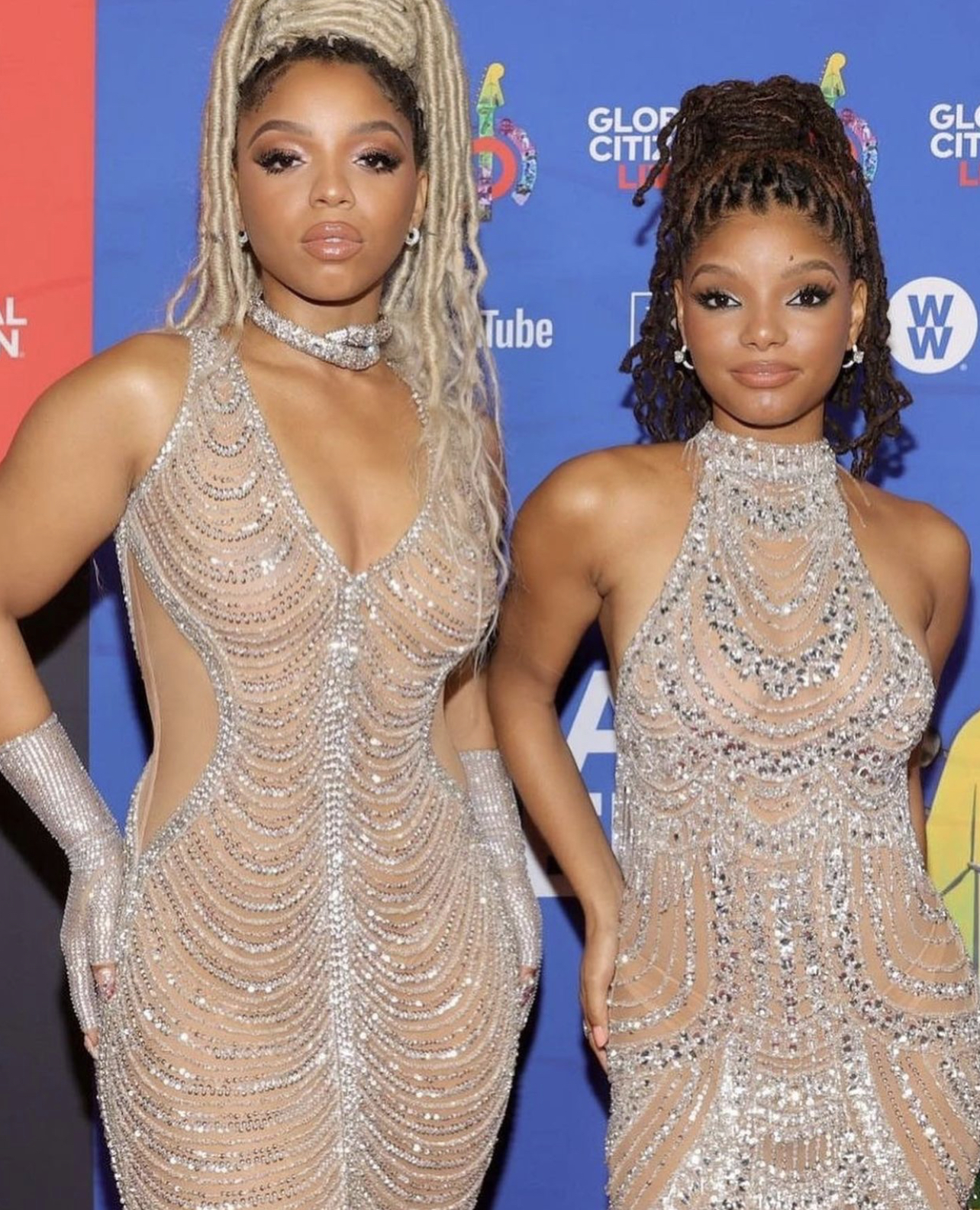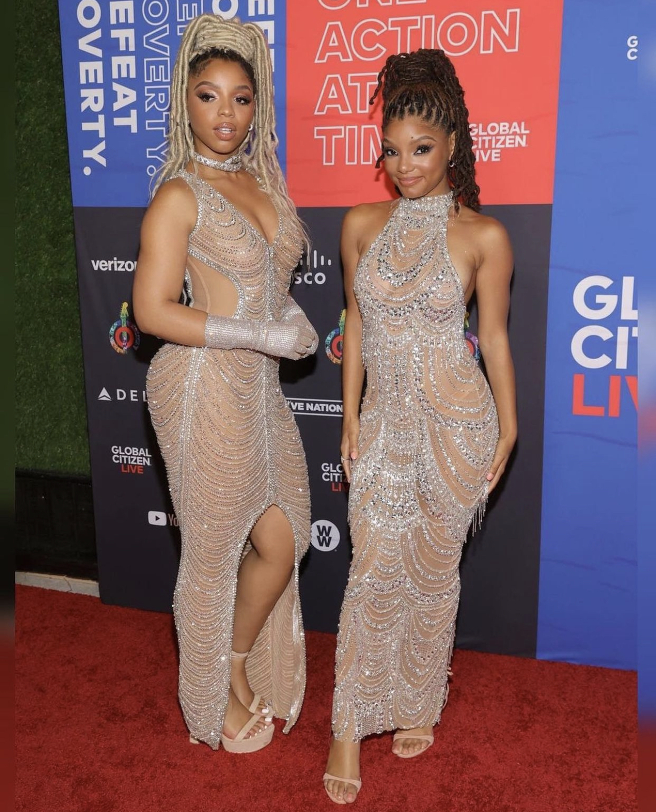 Chloe and Halle performed at the 2021 Global Citizen Live concert in Yousef Al Jasmi 2021 Couture crystal-adorned gowns. Chloe paired her dress with $75.23 “Wrapped Up In Love” suede lace-up heels from Oh Polly, Falllon Jewelry pieces, and Gucci crystal gloves. Halle went with $325 Flor de Maria “Claudia” sandals. Both looks were styled by Nikki Cortez.