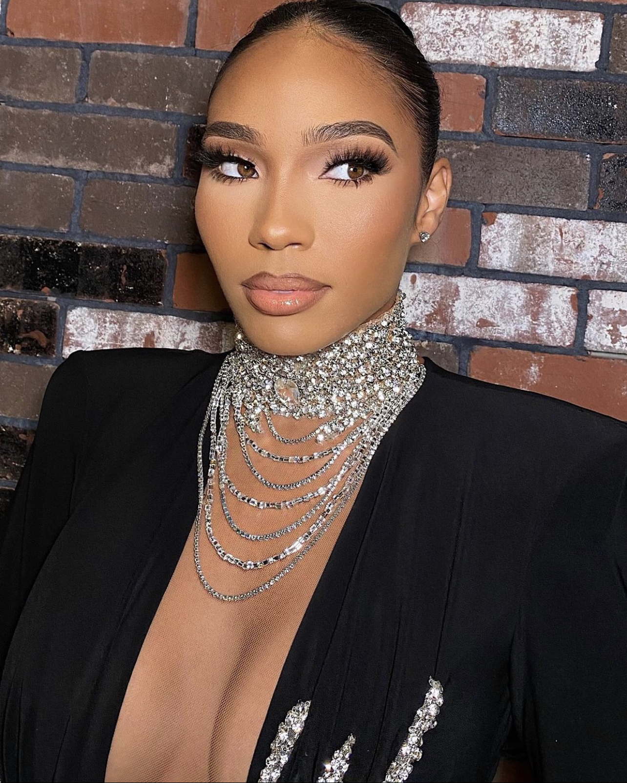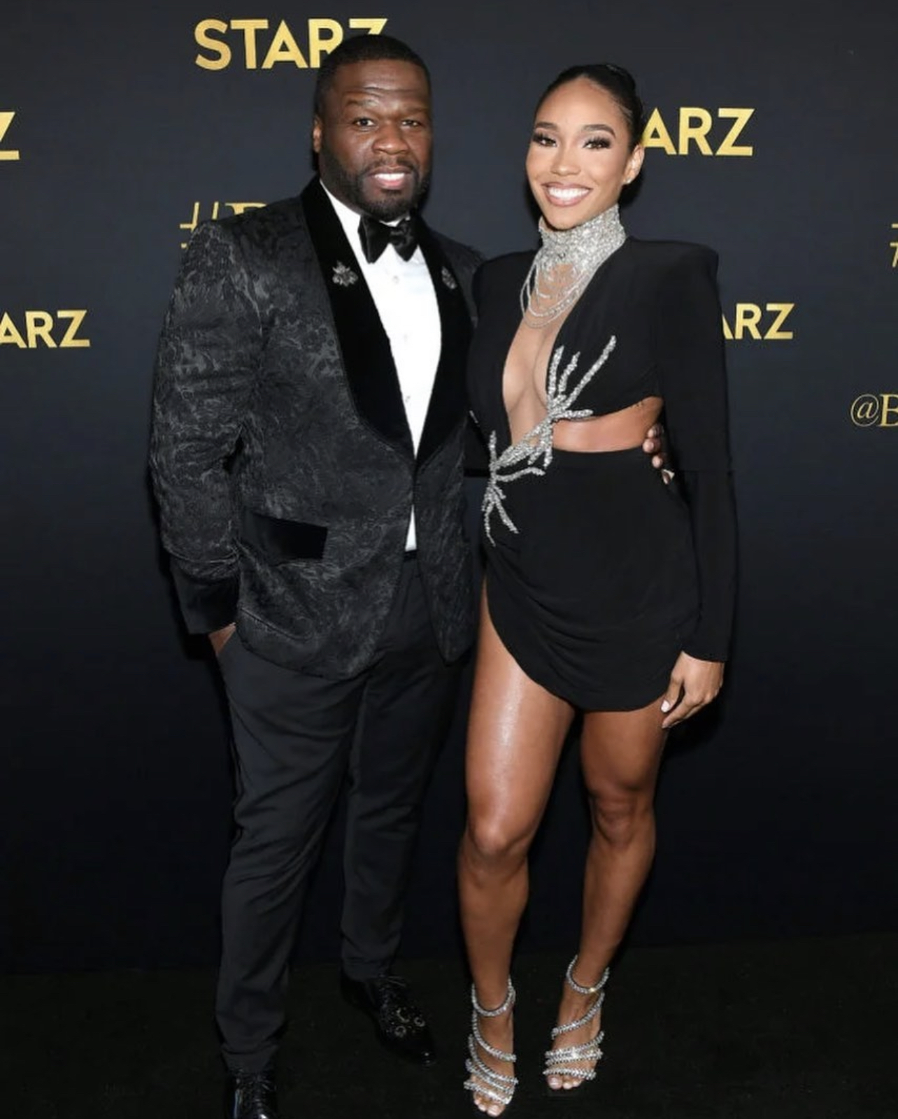 Jamira ‘Cuban Link’ Haines attended the premiere of BMF with boyfriend and producer 50 Cent wearing black dress with a nude mesh detail and crystal embellishments by Albina Dyla x Ivy Showroom, styled by Naya Ashley. For accessories, she wore the $2,195 Jimmy Choo “Josefine 100” sandals.
