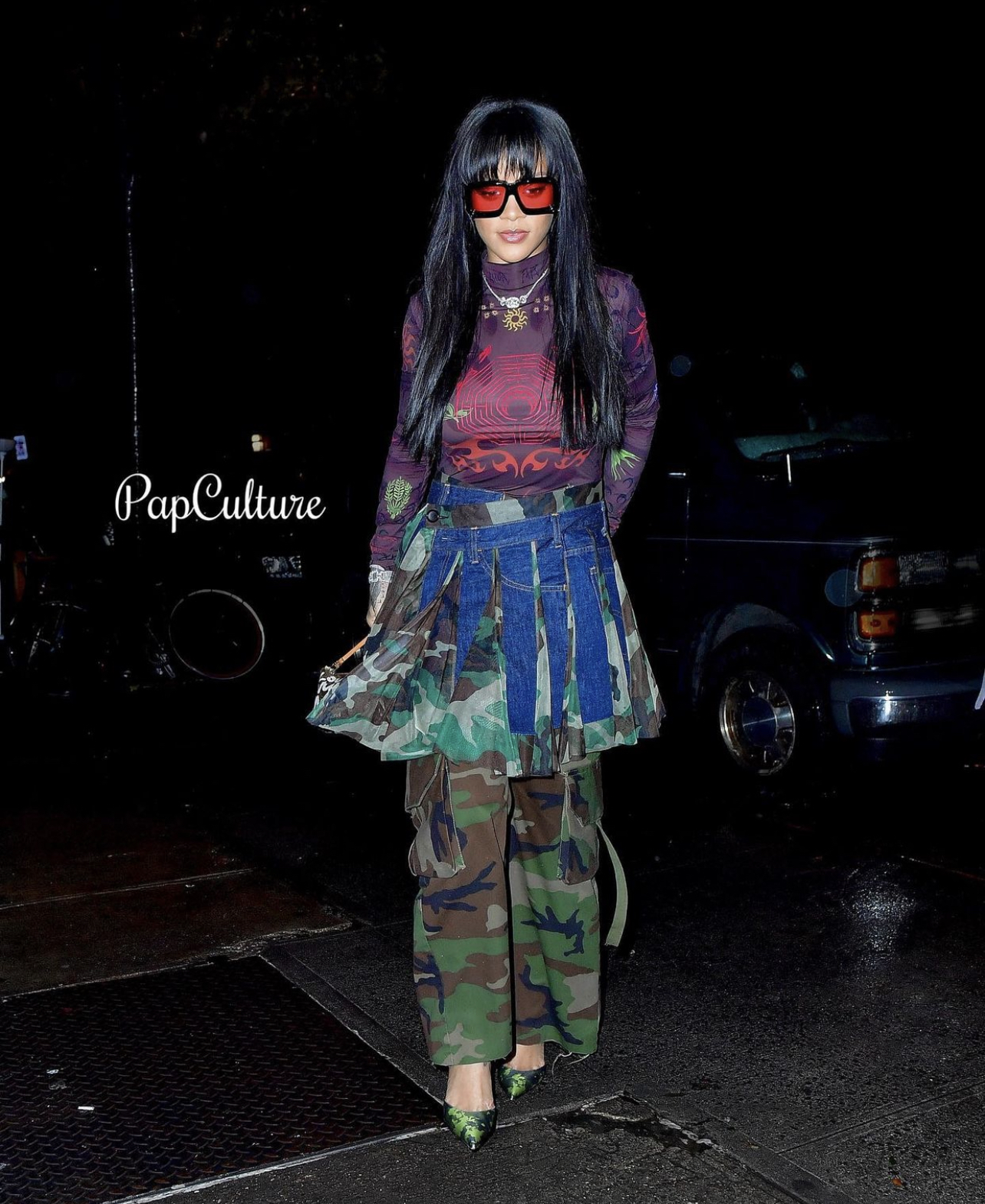 Rihanna made a past unusual trend a thing again as she stepped out in a major skirt-pants combo! Rihanna was spotted in the $430 Marine Serre Punk Shaded Second Skin Tattoo top paired with a Junya Watanabe Fall 2021 camo and denim pleated skirt worn over a pair of Matthew Adams Dolan 2015 camouflage cargo pants. She also wore $360 Paula’s Ibiza Dive sunglasses, a 2001 Louis Vuitton graffiti handbag, and Amina Muaddi Ursina camo pumps.