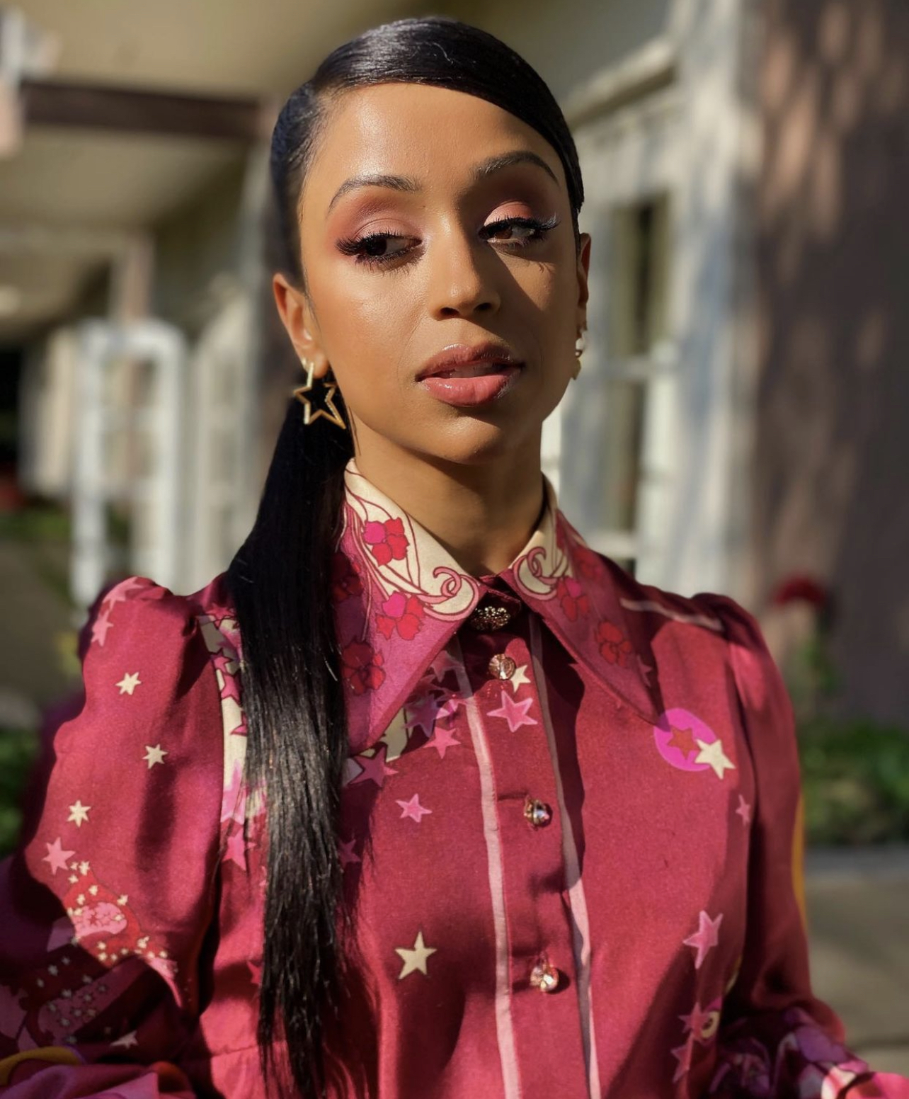 Jeezy and Jeannie Mai claimed the top spot for the most-liked look this week! Celebrating his birthday, Jeezy posed for a few flicks at his bash wearing a Tom Ford Spring 2018 watercolor blazer jacket, white button shirt, and classic black bow tie. He also rocked a custom pair of pink metallic trousers by Téo Flor. His look was styled by Kris Shelby. Jeannie Mai wore a black crystal embellished jumpsuit from Tata LA, styled by Mark Paul. She accessorized her look with Clarité black heeled mules, black sunglasses, and Jackie Mack Designs small hoop earrings.