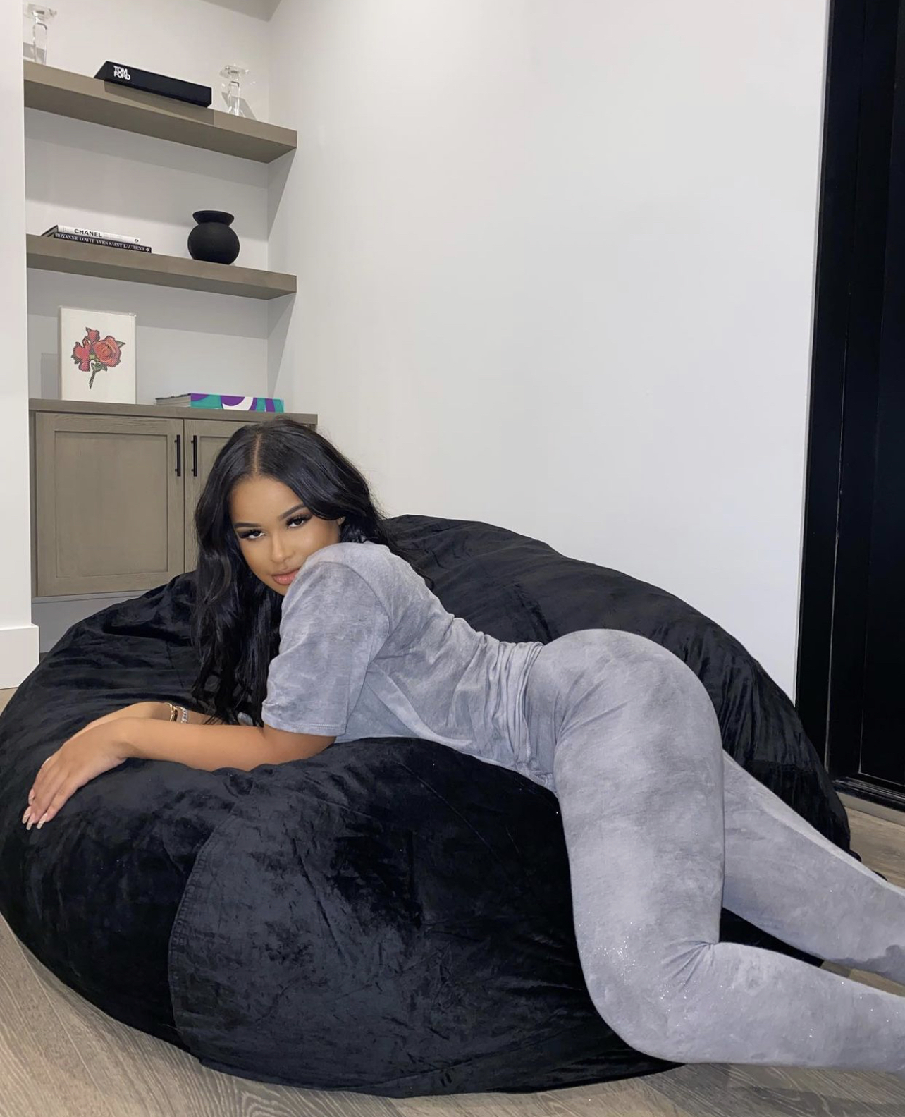 Taina Williams wore a grey set from Fashion Nova which included an oversized t-shirt and leggings. For accessories, she opted solely for bracelets since she was relaxing in her home.