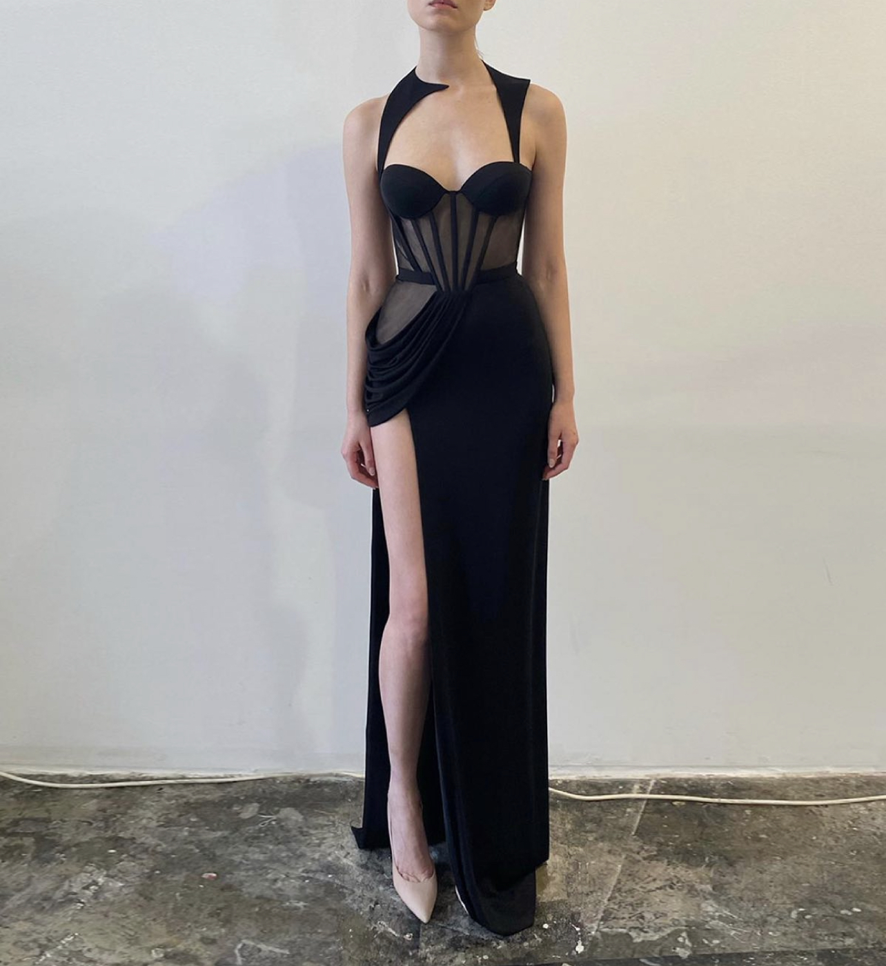 From the brand’s evening collection, the Alon Livné dress is quite the stunner with its corseted bodice matched with other eye-catching details like its structured cutouts and high slit which finds itself adorned with elegant drapery.