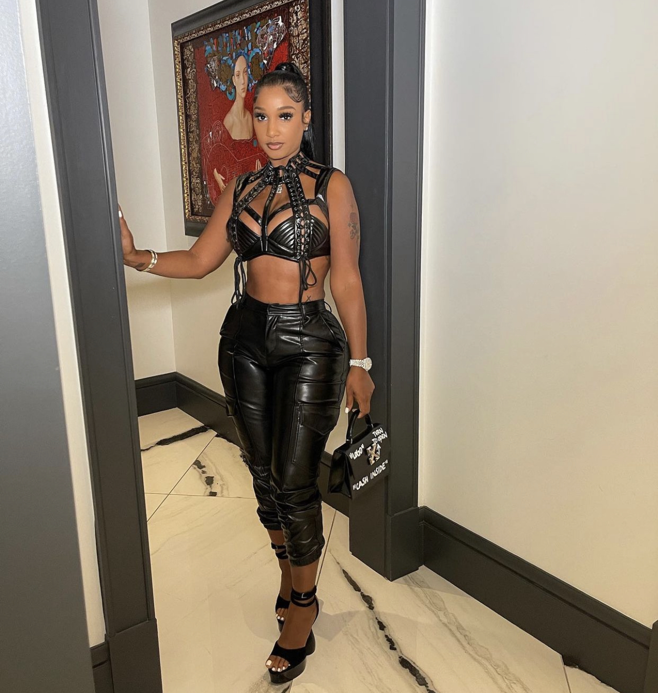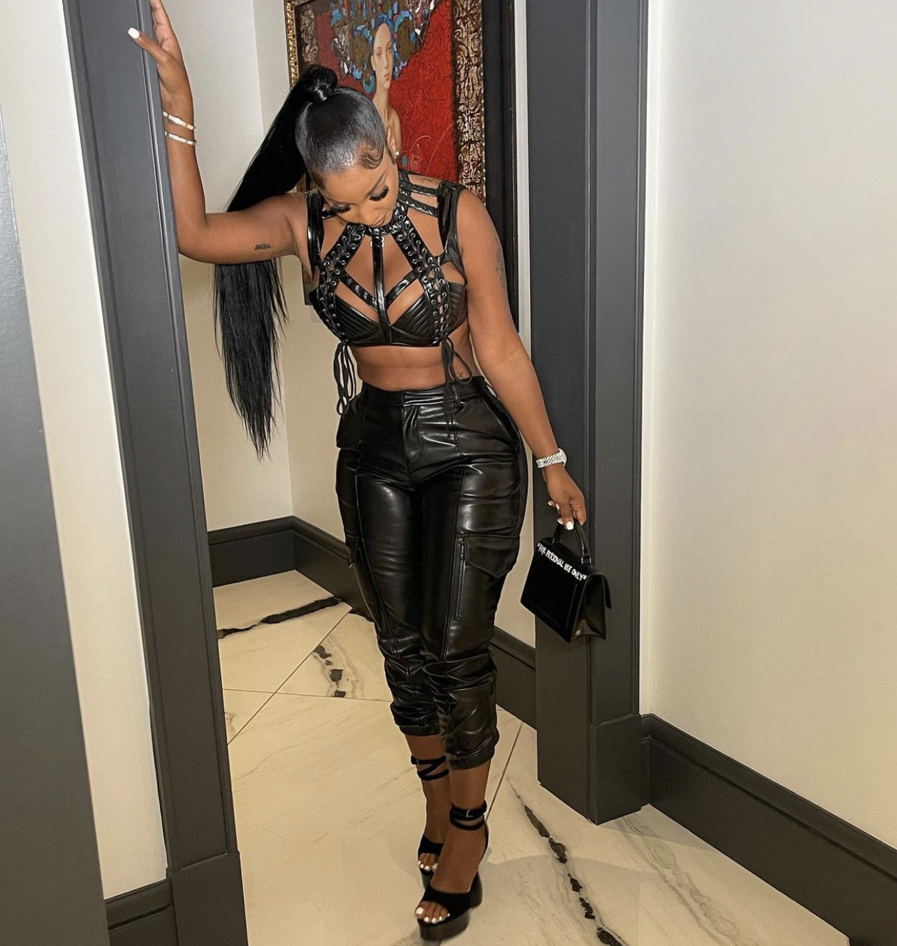 Bernice Burgos was getting ready to head out for the night in a head-turning edgy chic look. The model struck a pose in a eye-catching black top paired with Fashion Nova PU cargo trousers.