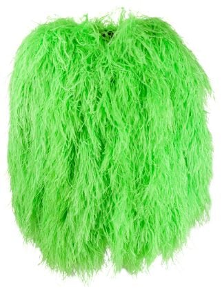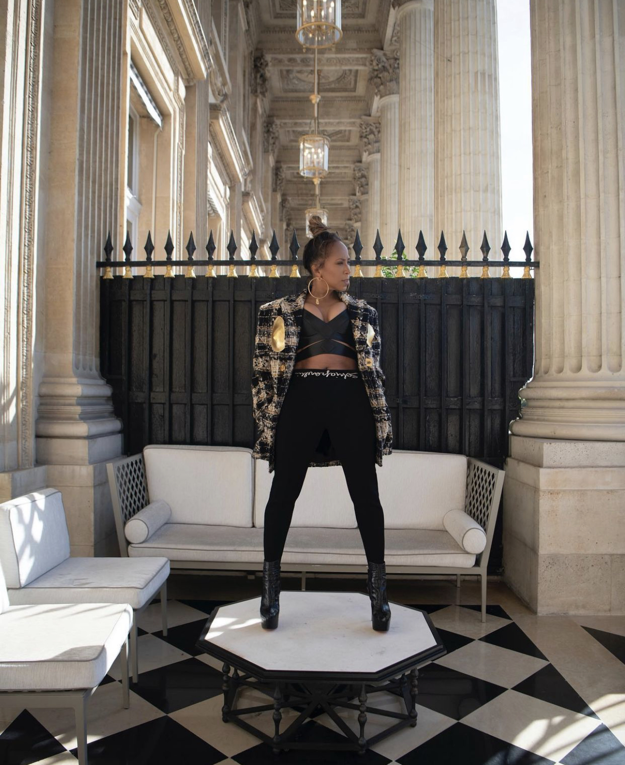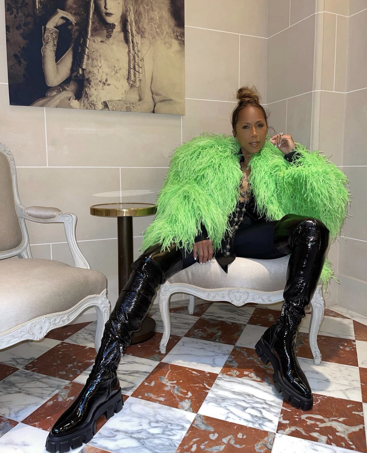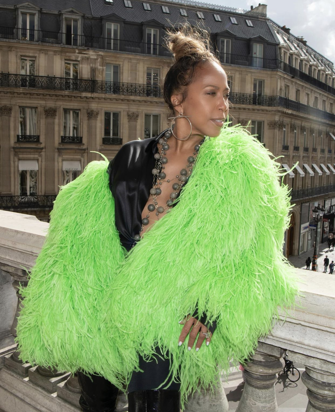 Harvey was spotted by the Place del Opera wearing a Saint Laurent by Anthony Vaccarello Fall 2019 lime green feather coat. Underneath the sassy coat, she wore what appears to be a black plunging satin top and trousers. She accessorized the look with Hermès loop earrings and $1,300 Prada Monolith Sharp Over the Knee Boots.