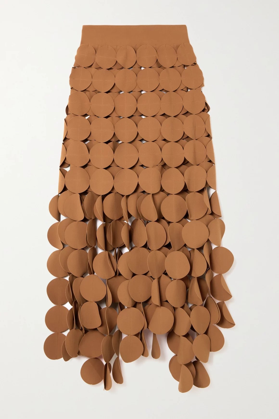 Harvey strutted the streets of Paris wearing a neutral-toned look including an off-the-shoulder top and $1,070 Awake Mode laser cut multi layer circle skirt. For accessories, she went with a baseball cap, Hermès loop earrings, and $745 nude Louboutin So Kate patent leather pumps.