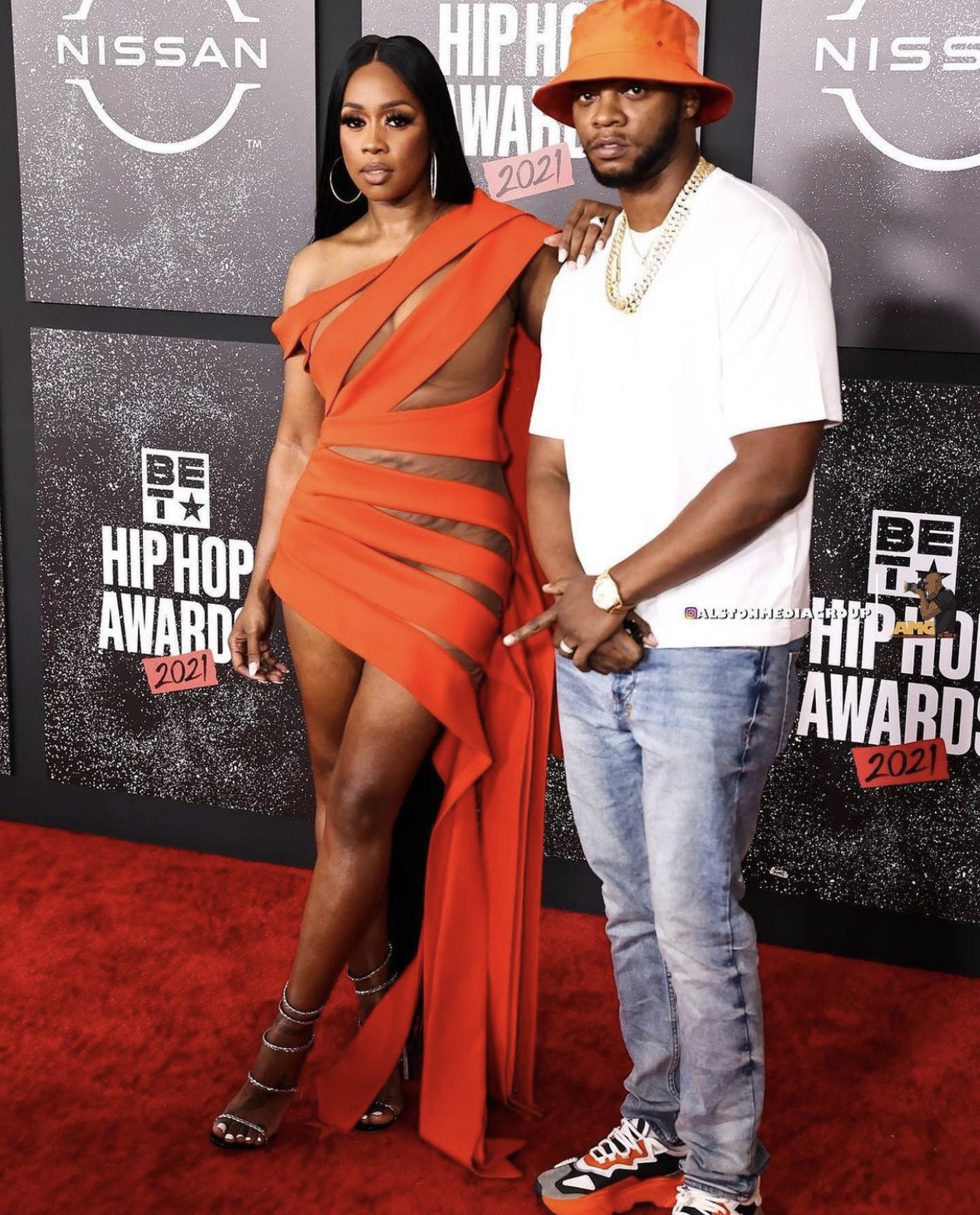 Remy Ma posed with Papoose wearing a dress by D’Anthony Designz. She paired her look with a pair of Giuseppe Zanotti crystal embellished sandals.