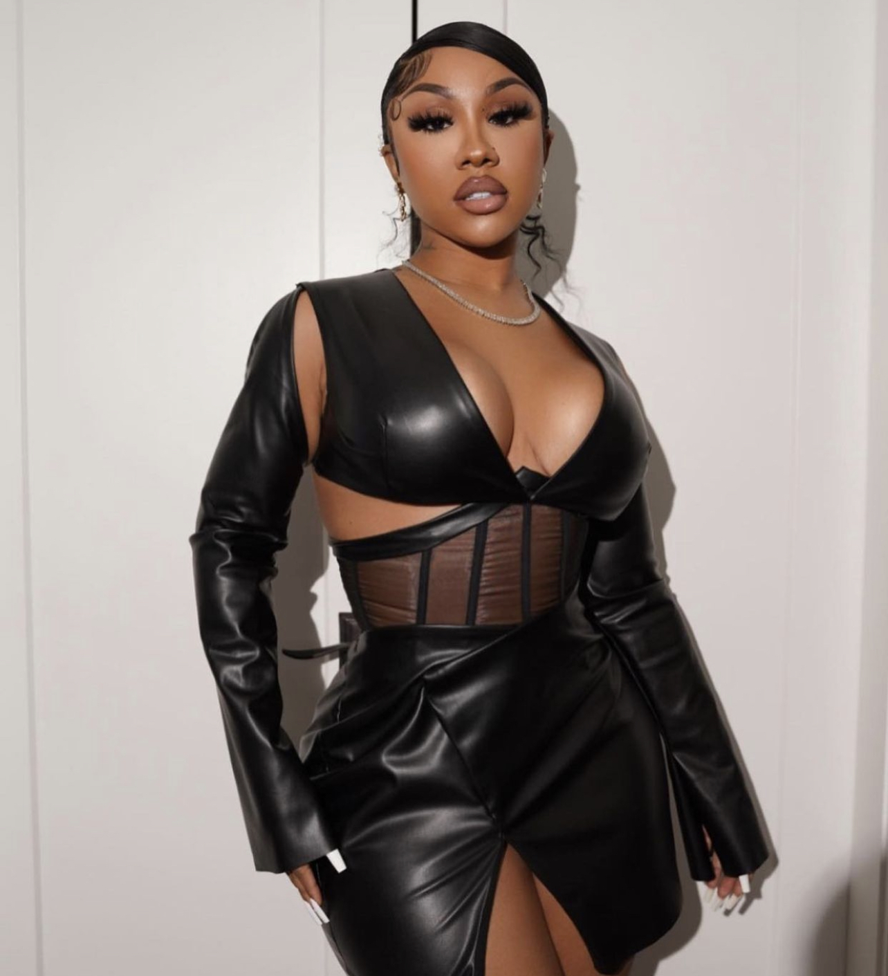 Erica Banks was spied in a Jock Monocc custom black feather and fringe-embellished leather dress, styled by SuperDope Q.