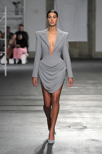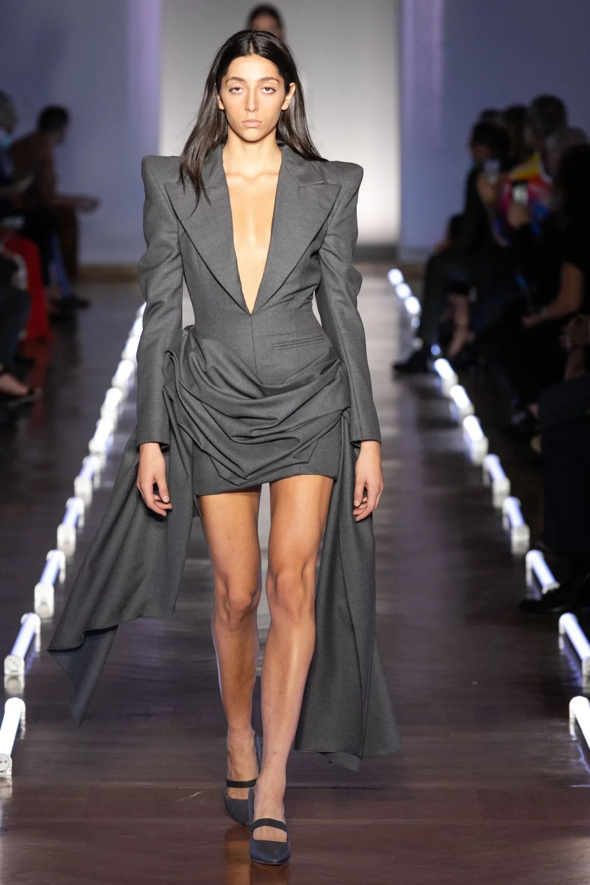 Part of both the Spring 2020 and 2021 collections, Francesco Murano’s “Ossimoro Dress” takes on the structure of both a blazer and dress, ultimately coming together as a sophisticated-chic mini jacket dress. Standout details of the piece include its plunging neckline, classic collar, and broad shoulders. Of course, let’s not forget its elegant drapery which cascades the skirt of the dress. While the Spring 2020 dress appears with a more subtle drape, the Spring 2021 piece serves as an updated version with a much longer drape component in a darker grey tone.