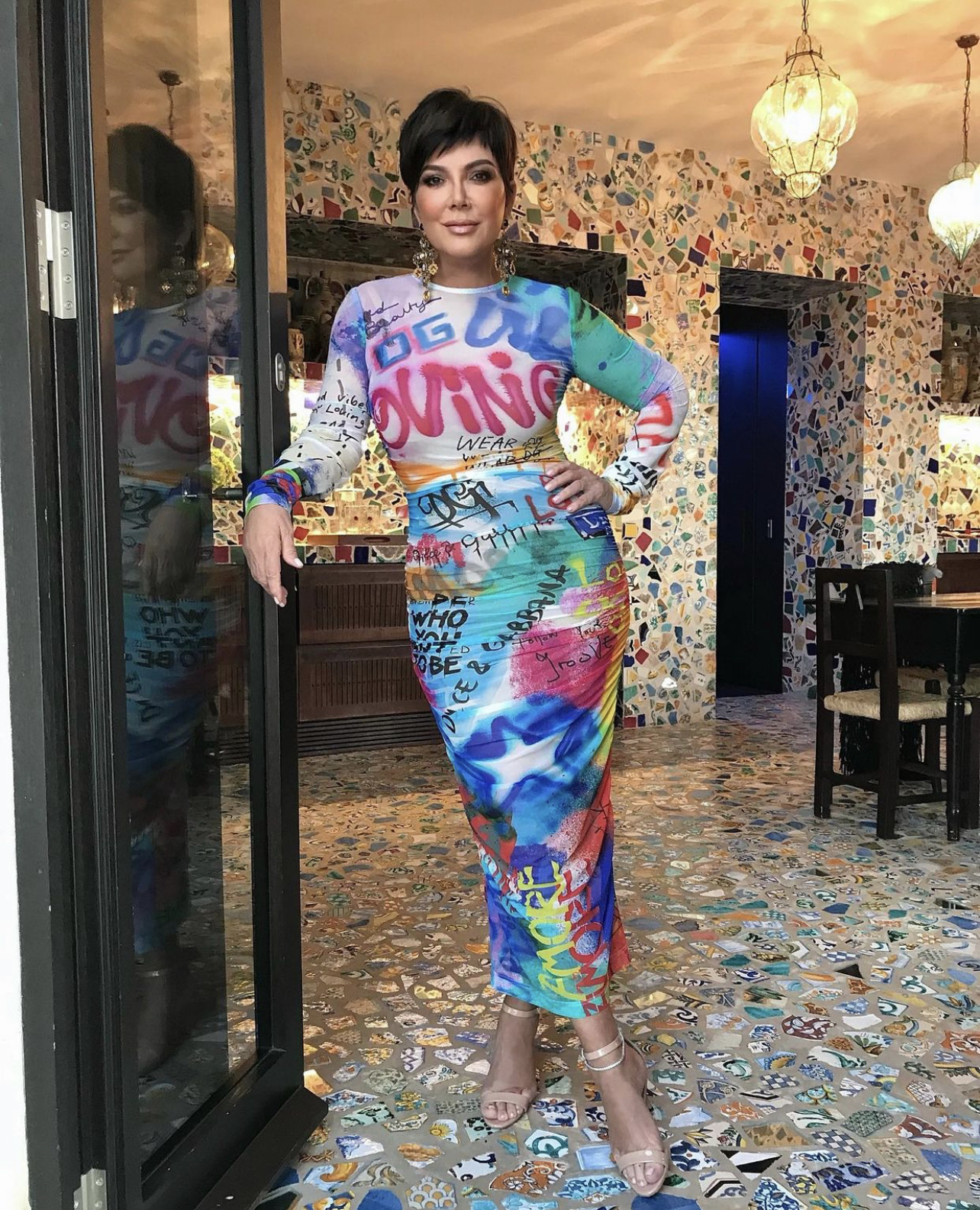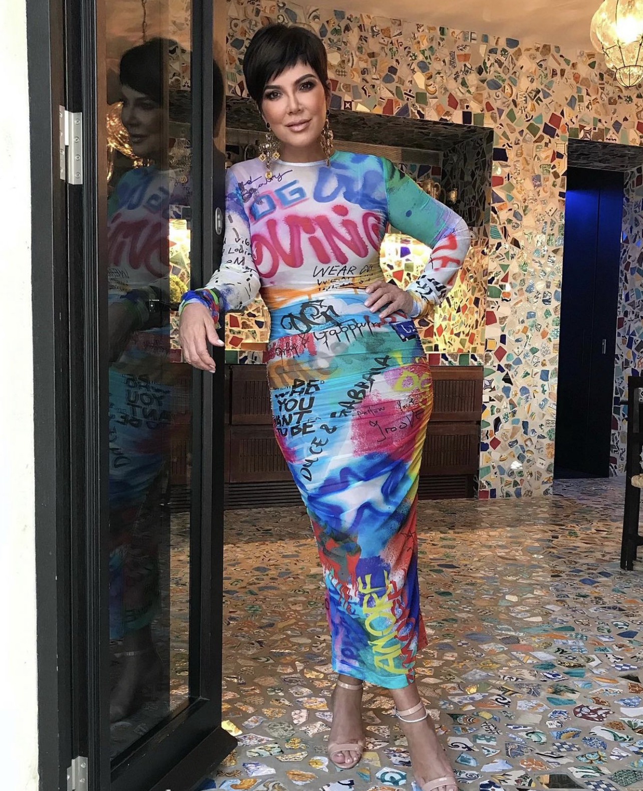 During her trip to Italy, Kris Jenner wore the same $2,845 Dolce and Gabbana printed midi dress paired with dangly earrings and nude sandals. To accompany the look, she sported her signature pixie haircut.